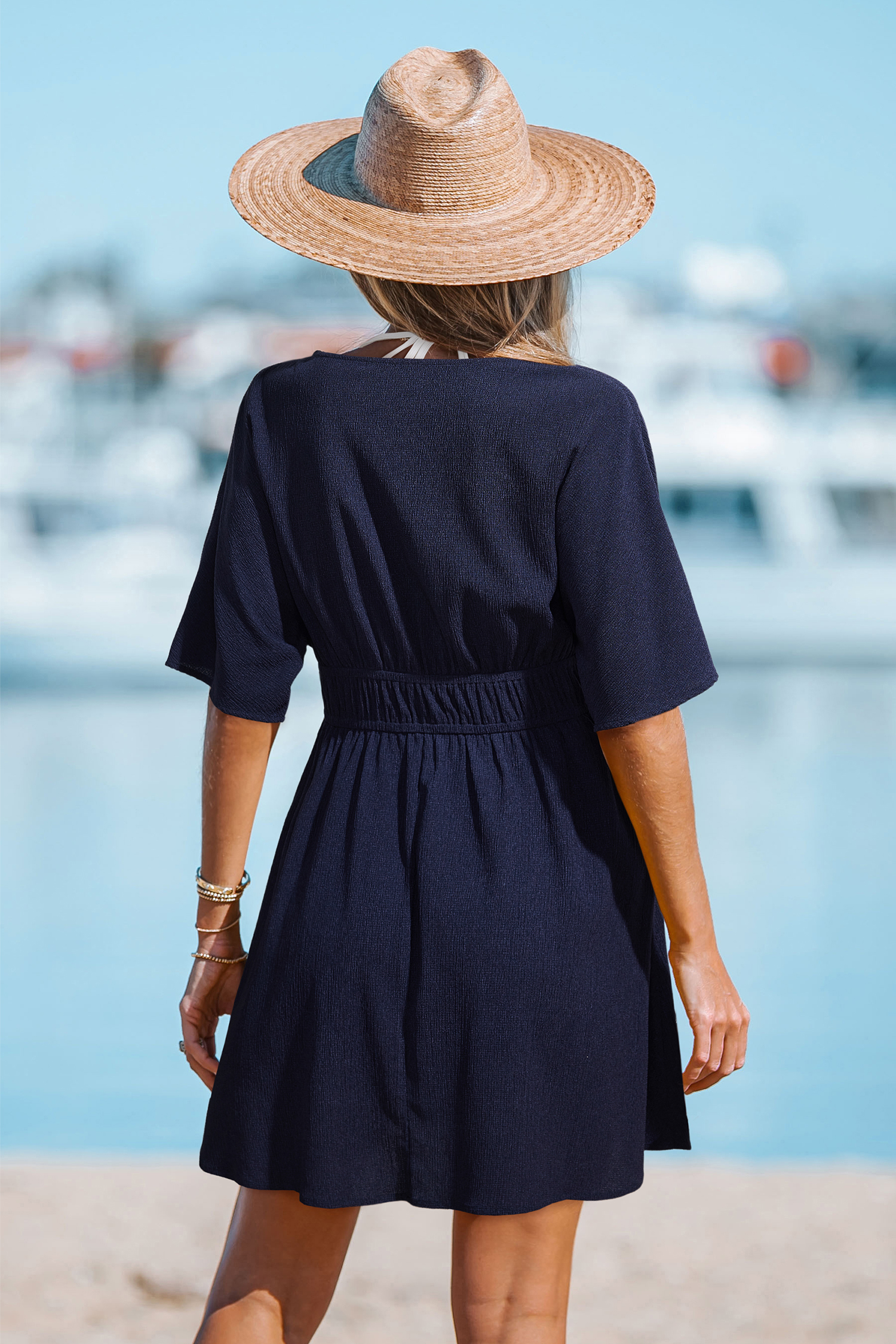 Il mini abito Andros Blue Cover-Up è perfetto per le rilassate giornate in spiaggia e per i momenti in cui vuoi indossarlo velocemente! La scollatura profonda, le maniche corte e la lunghezza mini lo rendono fresco e pronto per uscire.