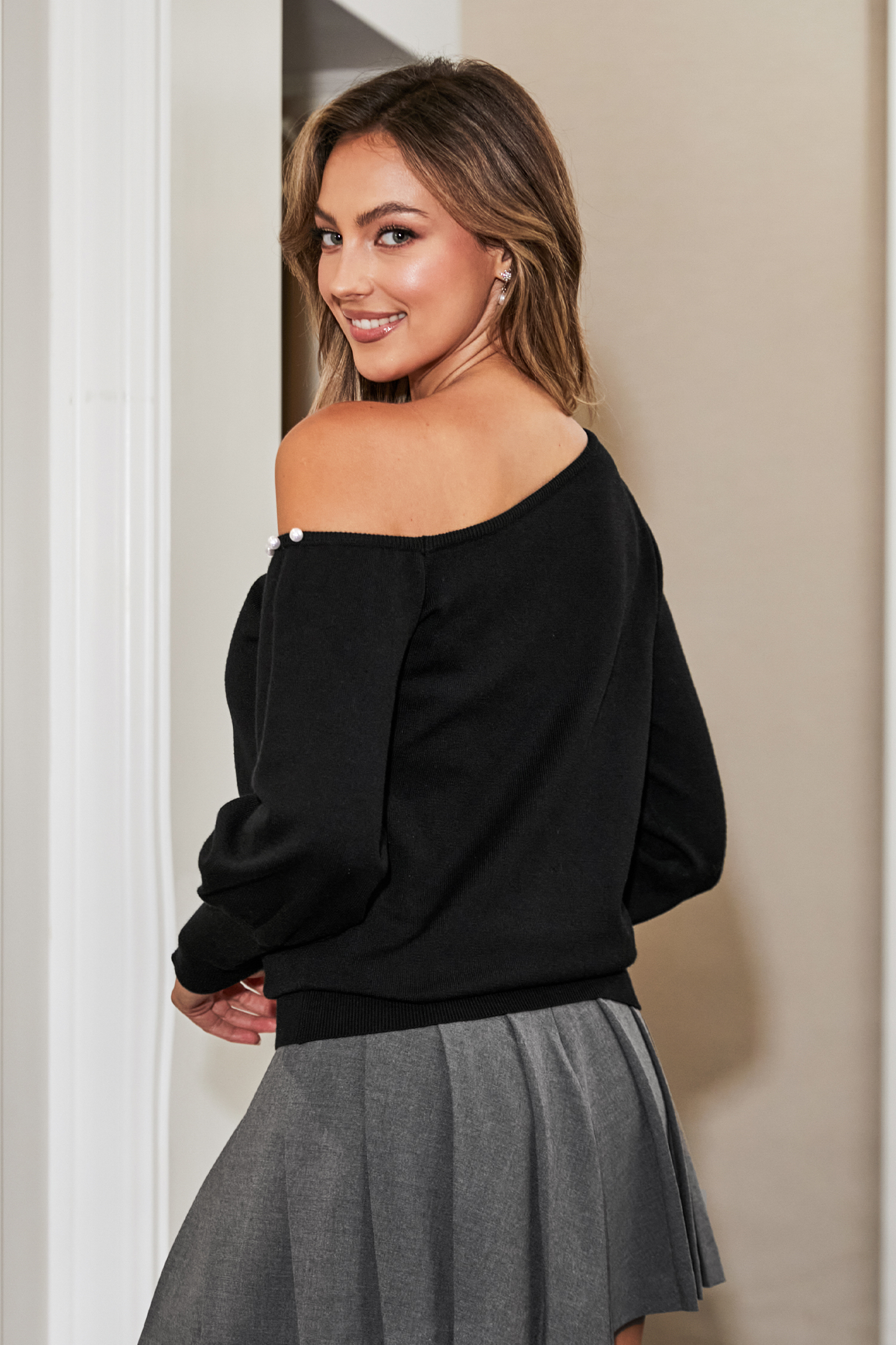 Maglione nero con maniche a sbuffo e spalle scoperte e perline