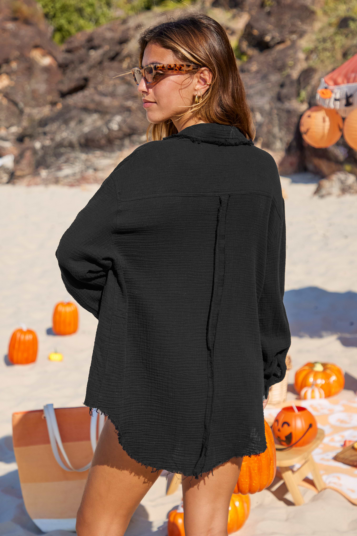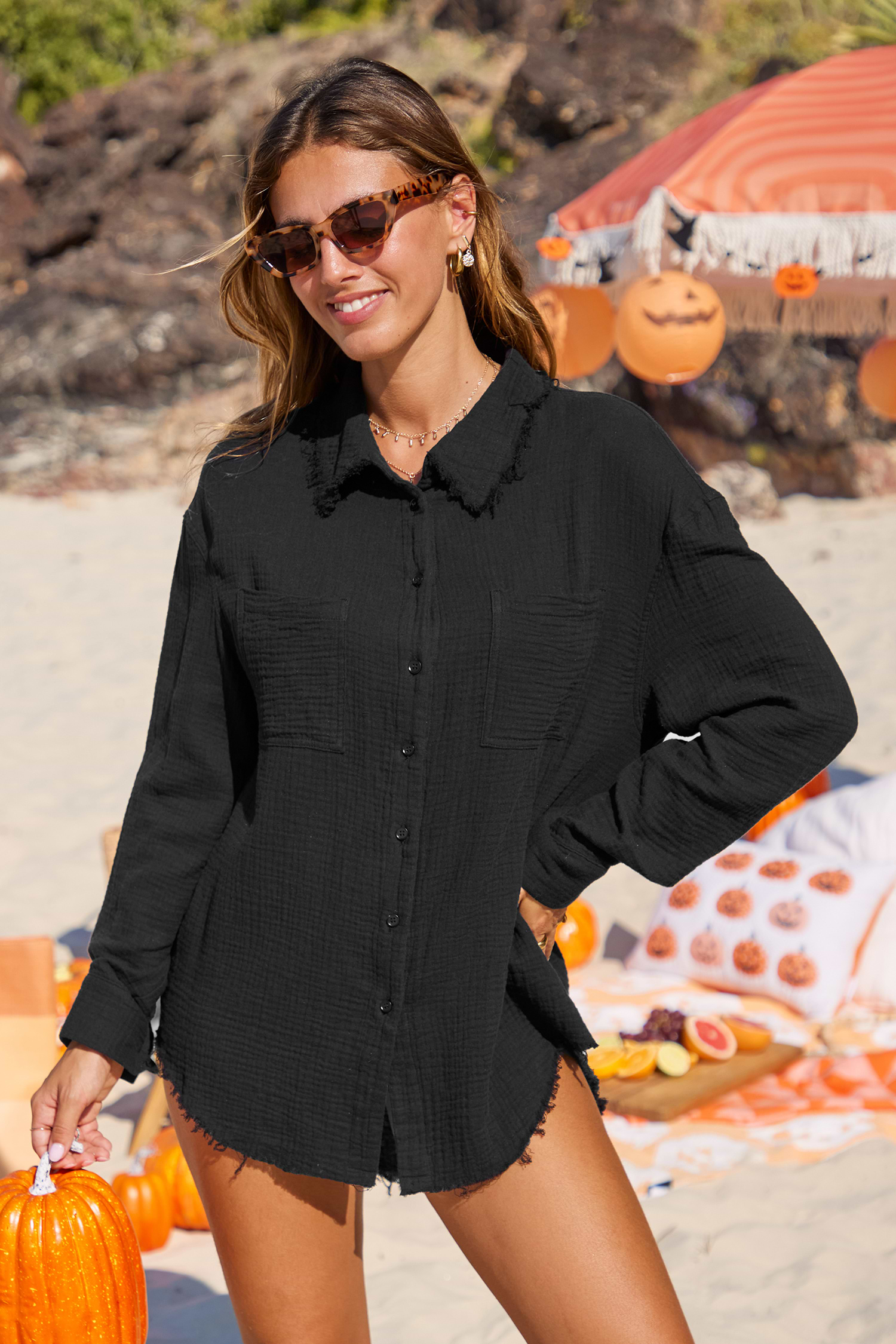 Camicia nera con colletto abbottonato e orlo sfilacciato