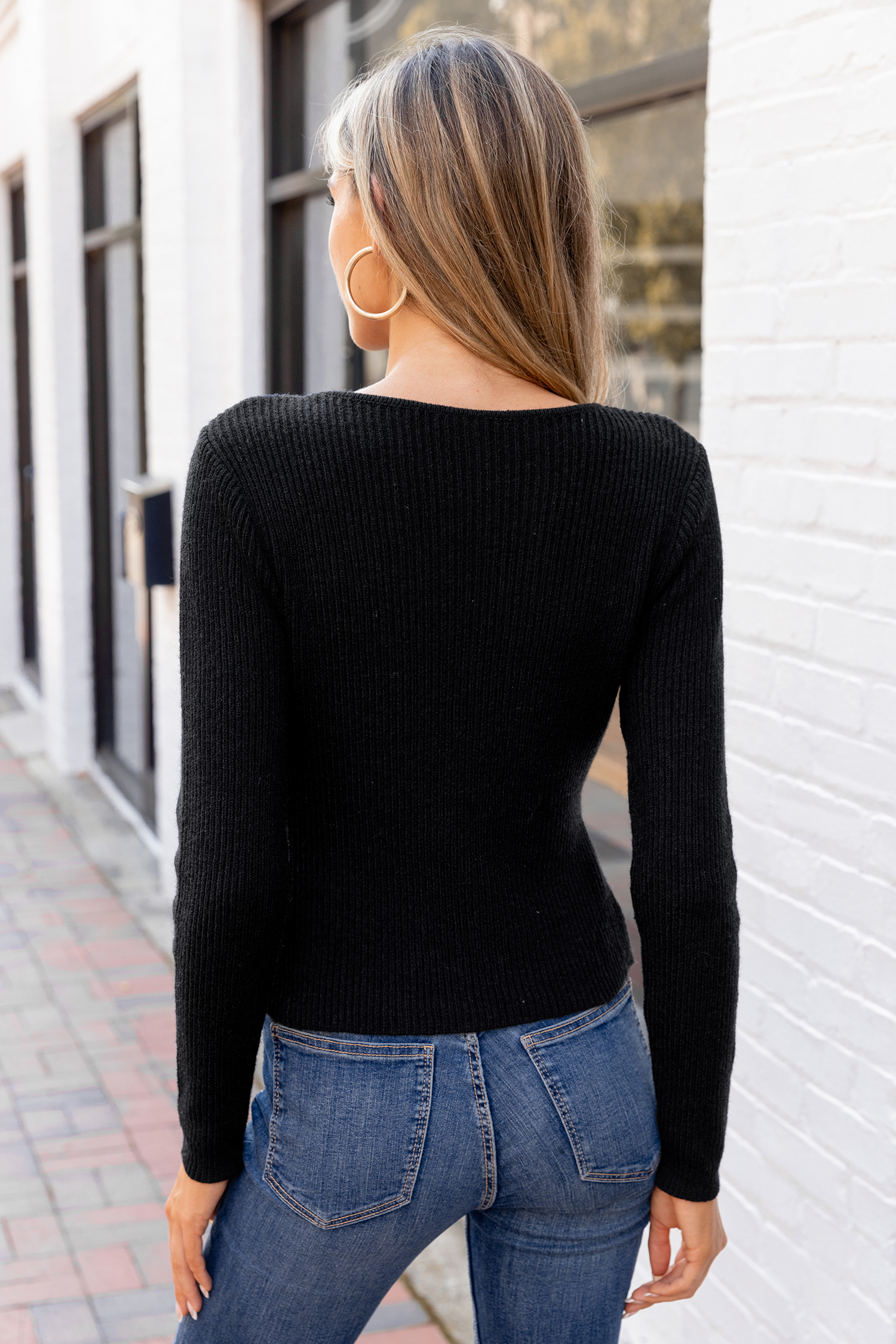Top nero lavorato a maglia con scollo tondo e maniche lunghe