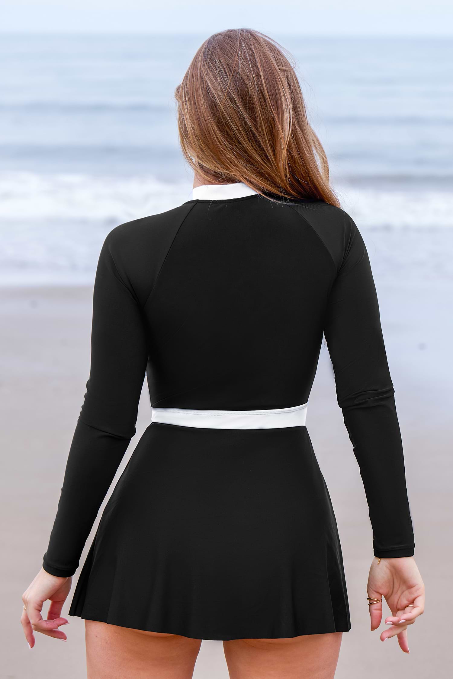Abito da bagno nero con cerniera frontale a maniche lunghe con scollo tondo