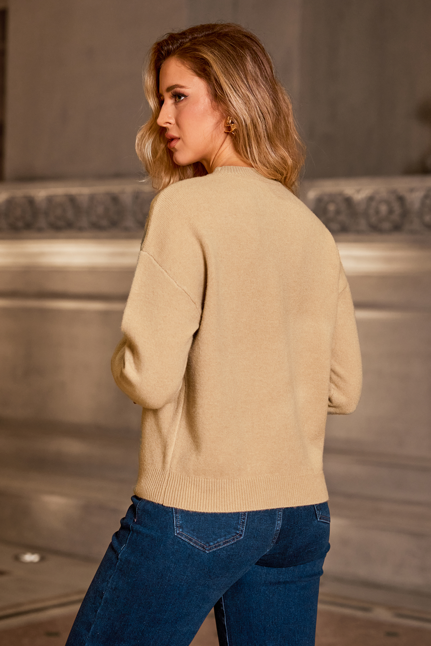 Il maglione color cachi Bling It On è fatto per brillare! Con scollo rotondo, maniche lunghe e dettagli floreali in paillettes, è una scelta comoda con un tocco di brillantezza in più.