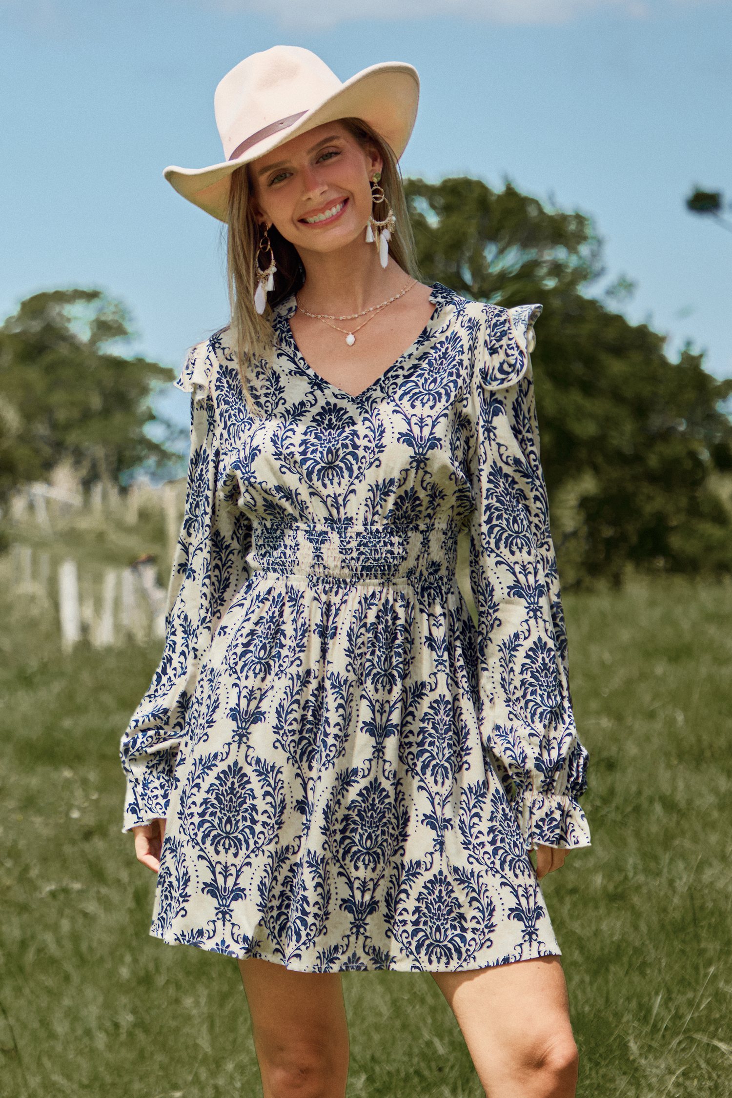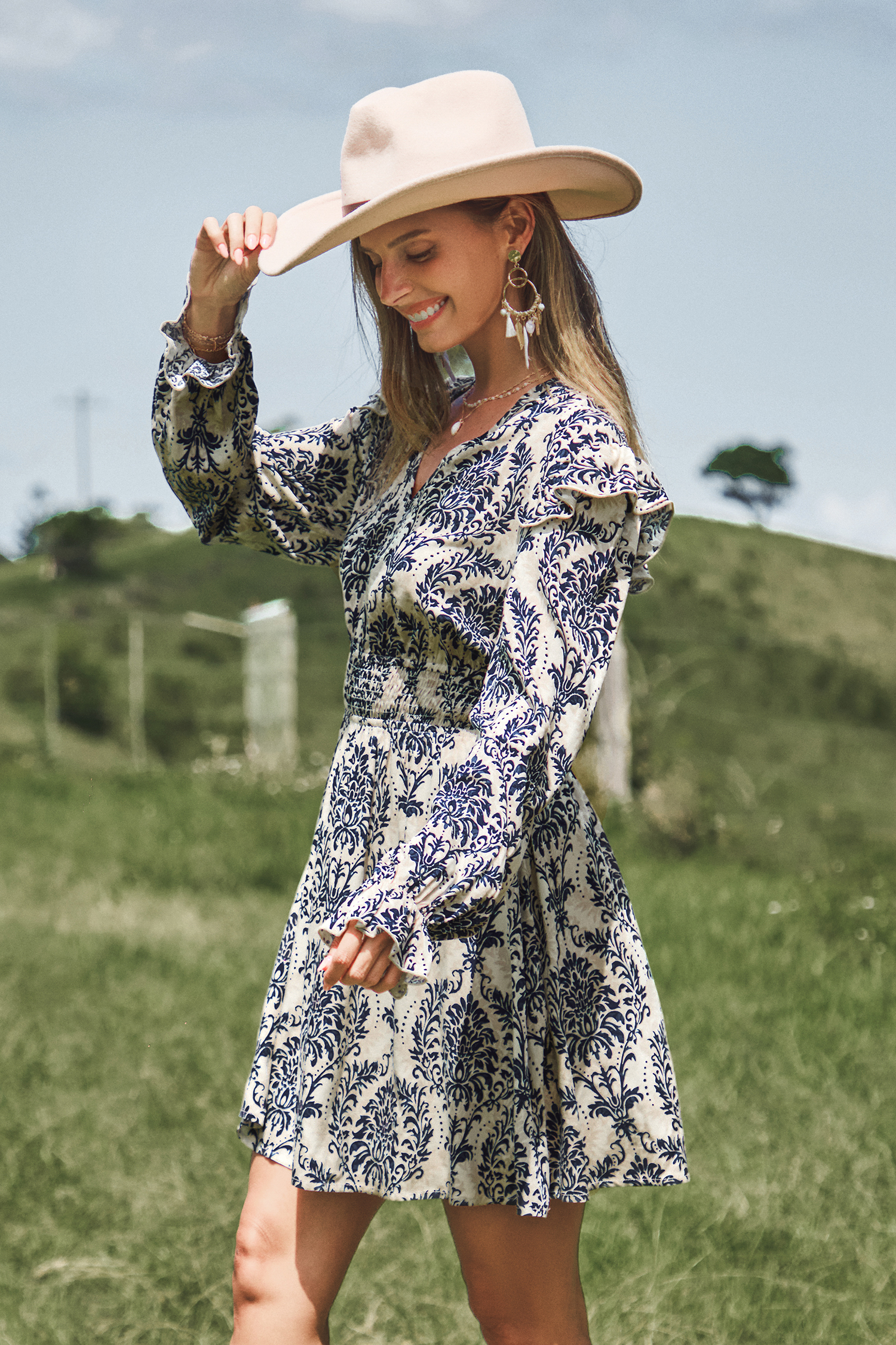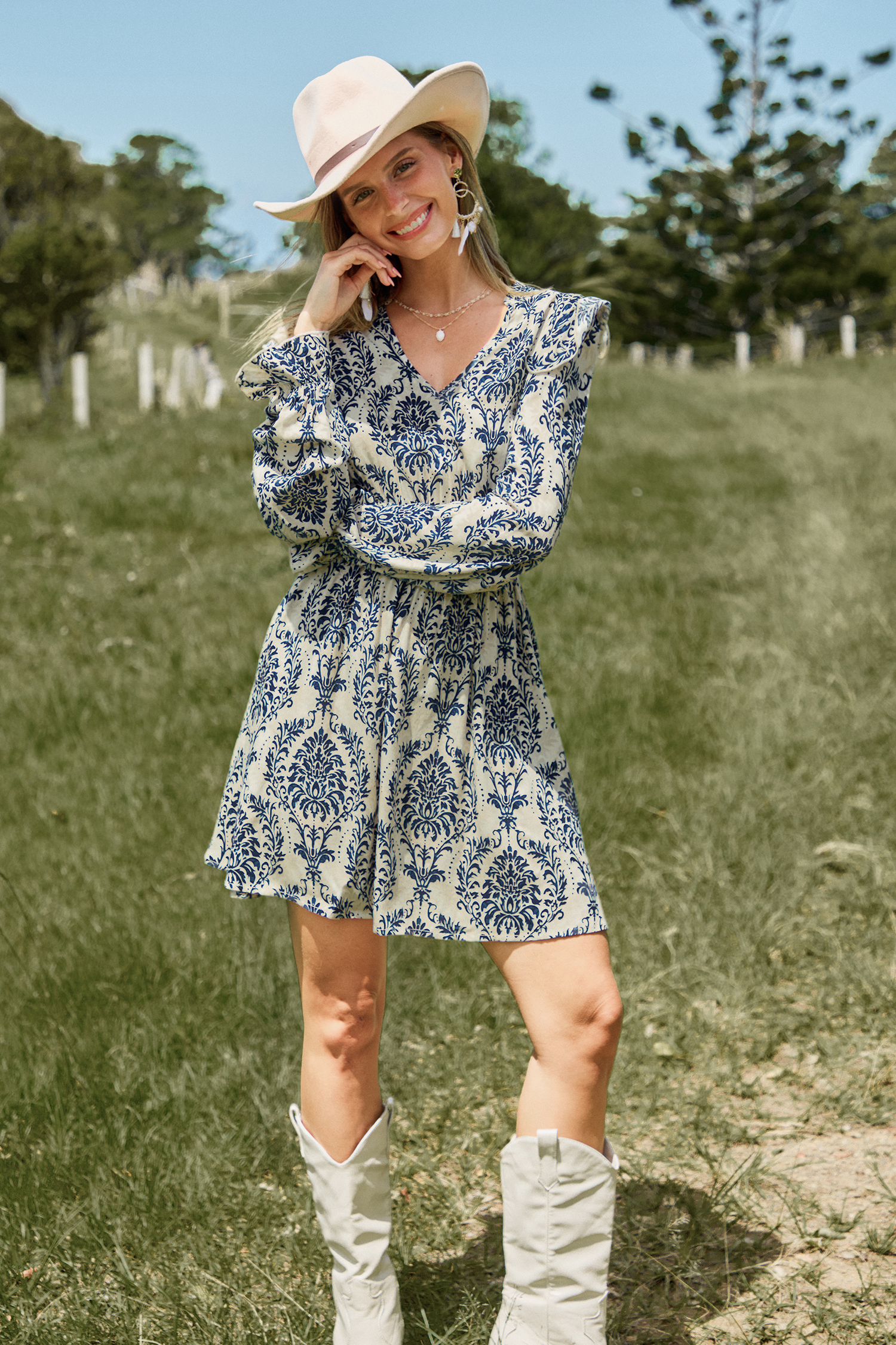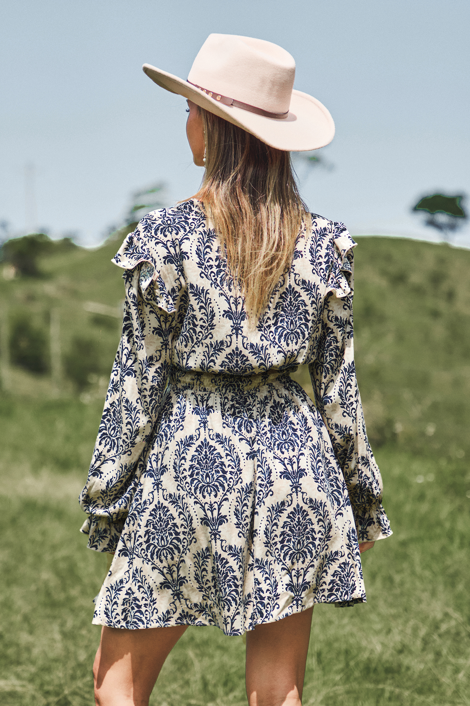 Mini abito blu damascato con maniche a palloncino