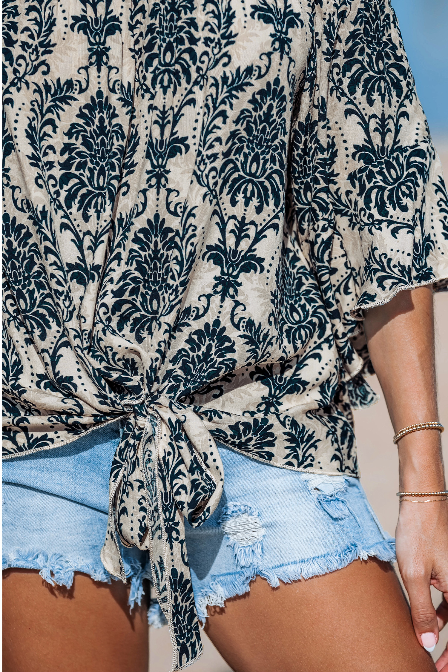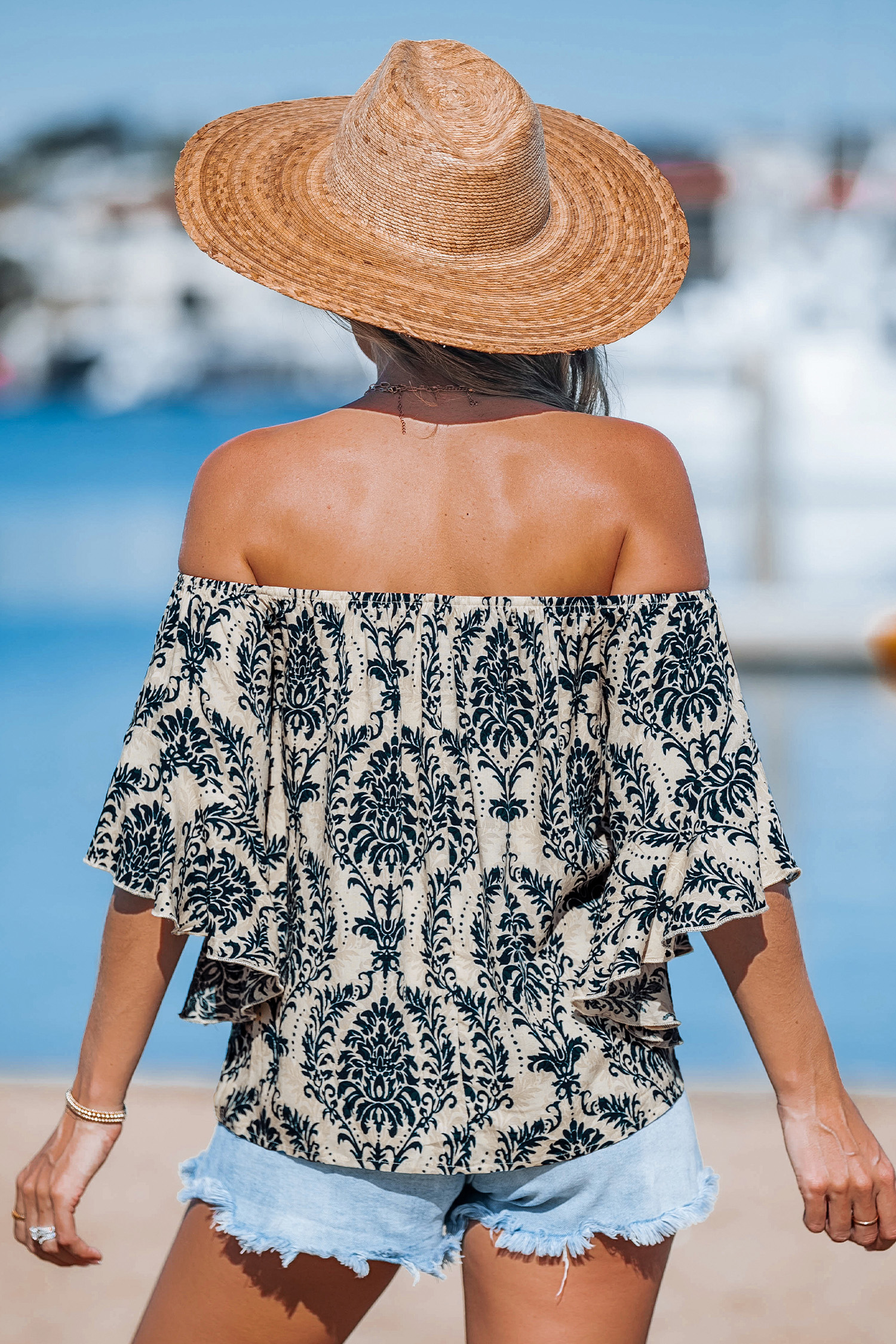 Blusa a maniche svasate con spalle scoperte in damasco blu