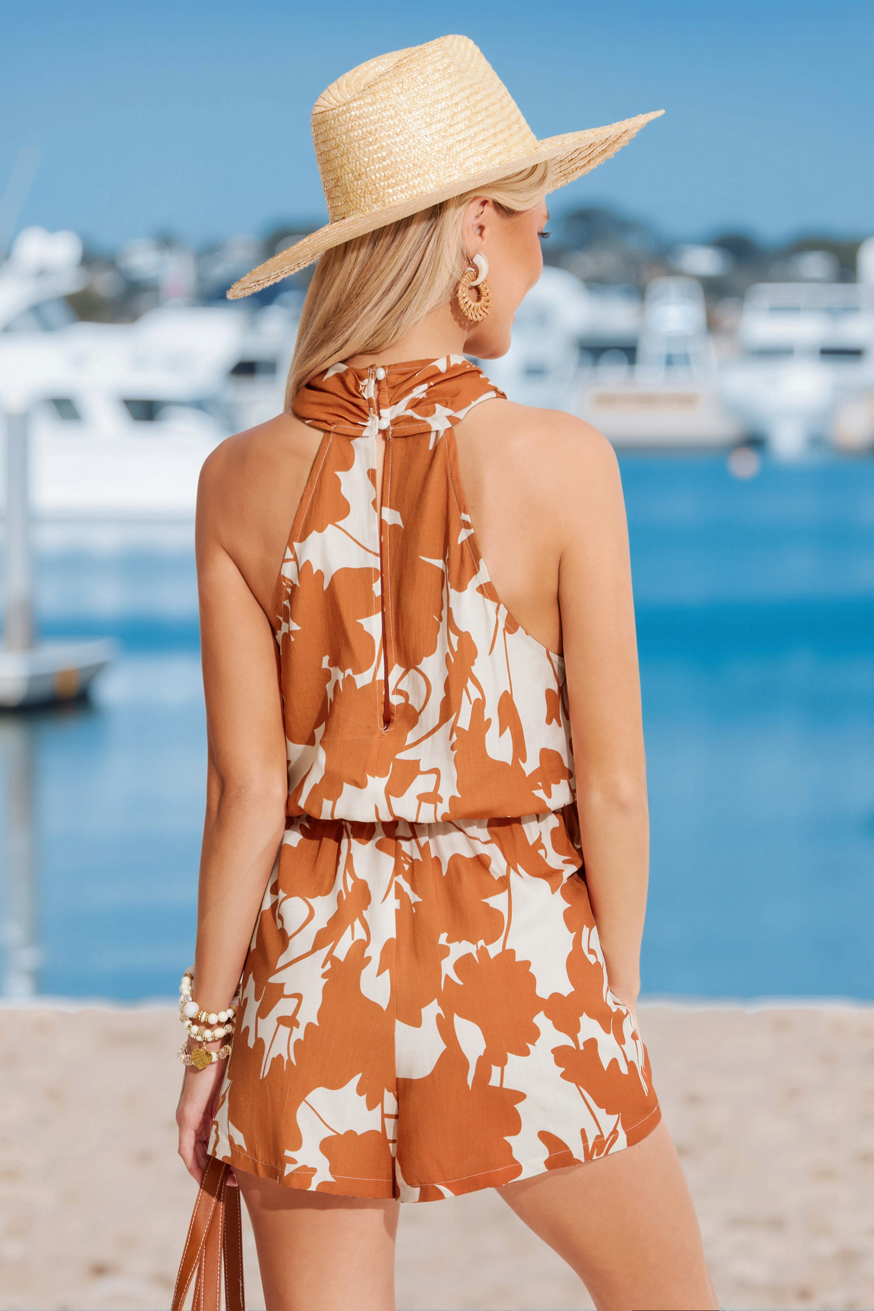 Tuta a gamba larga con scollo all'americana incrociato tropicale marrone
