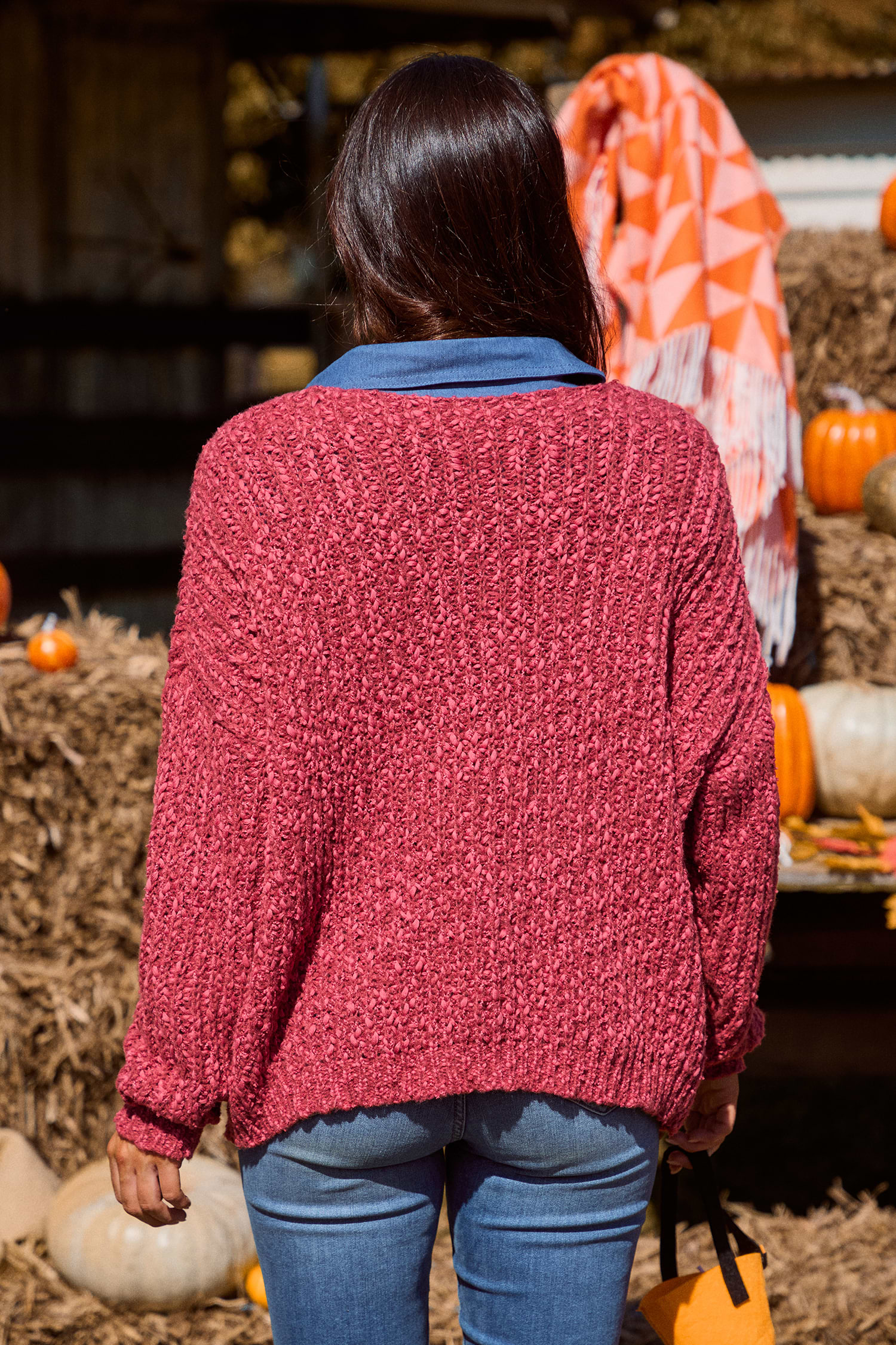 Maglione con scollo a V e maniche a sbuffo color bordeaux