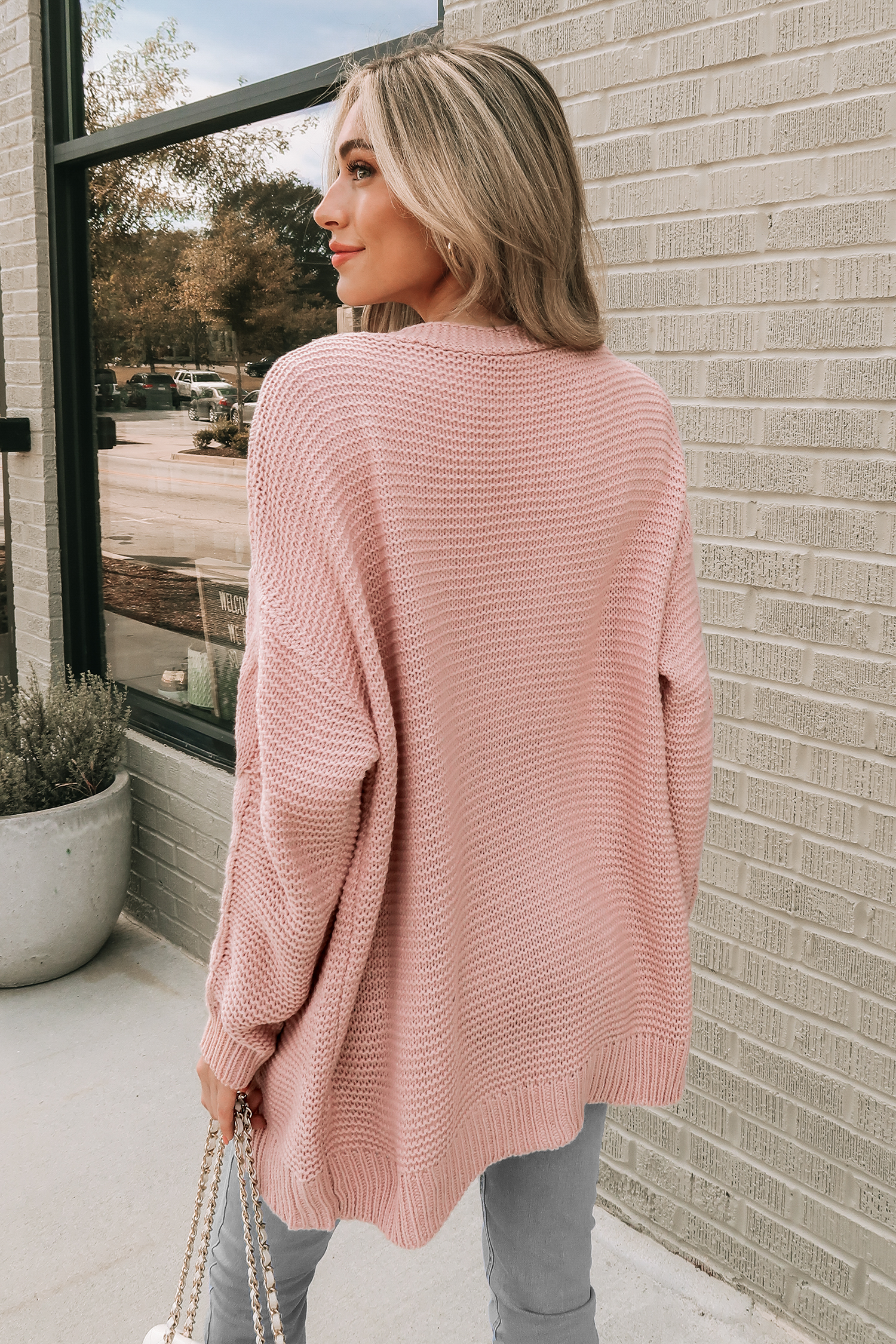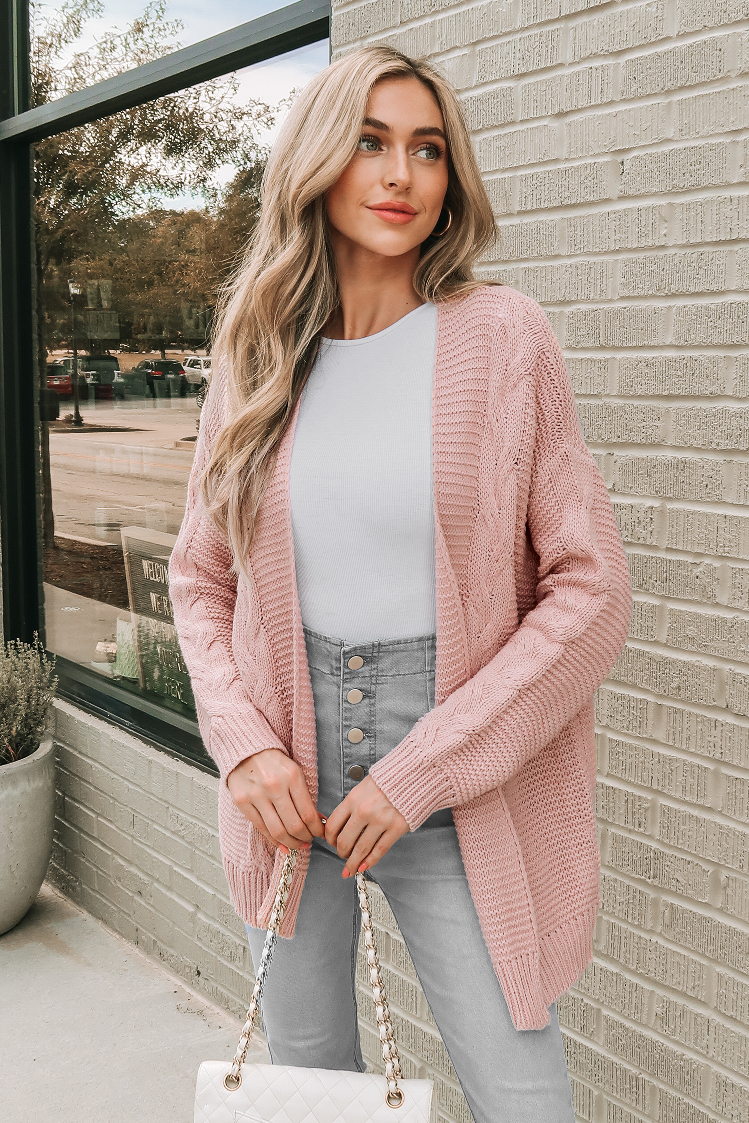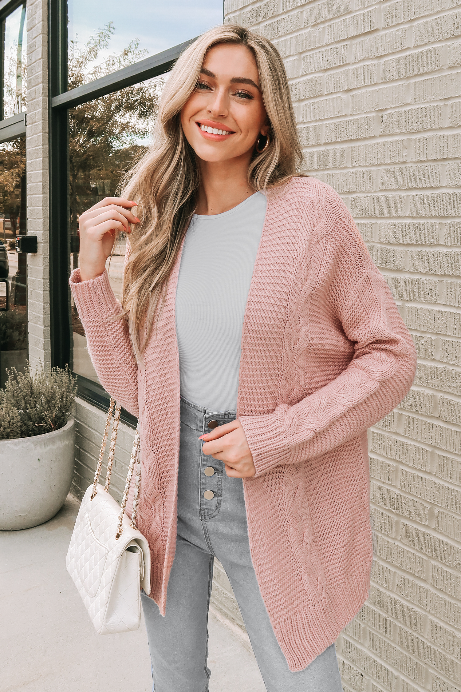 Cardigan aperto sul davanti in maglia a trecce rosa cipria
