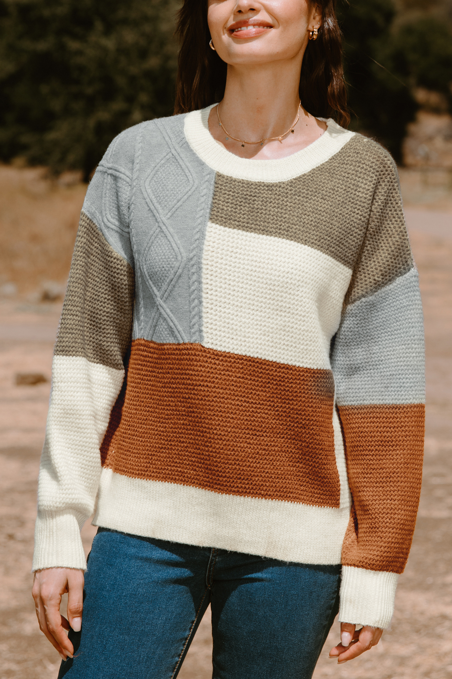 Il maglione a maniche lunghe con scollo rotondo e spalle scese colorblock è caratterizzato da un audace motivo colorblock e da una vestibilità comoda, perfetta per distinguersi senza rinunciare alla comodità.