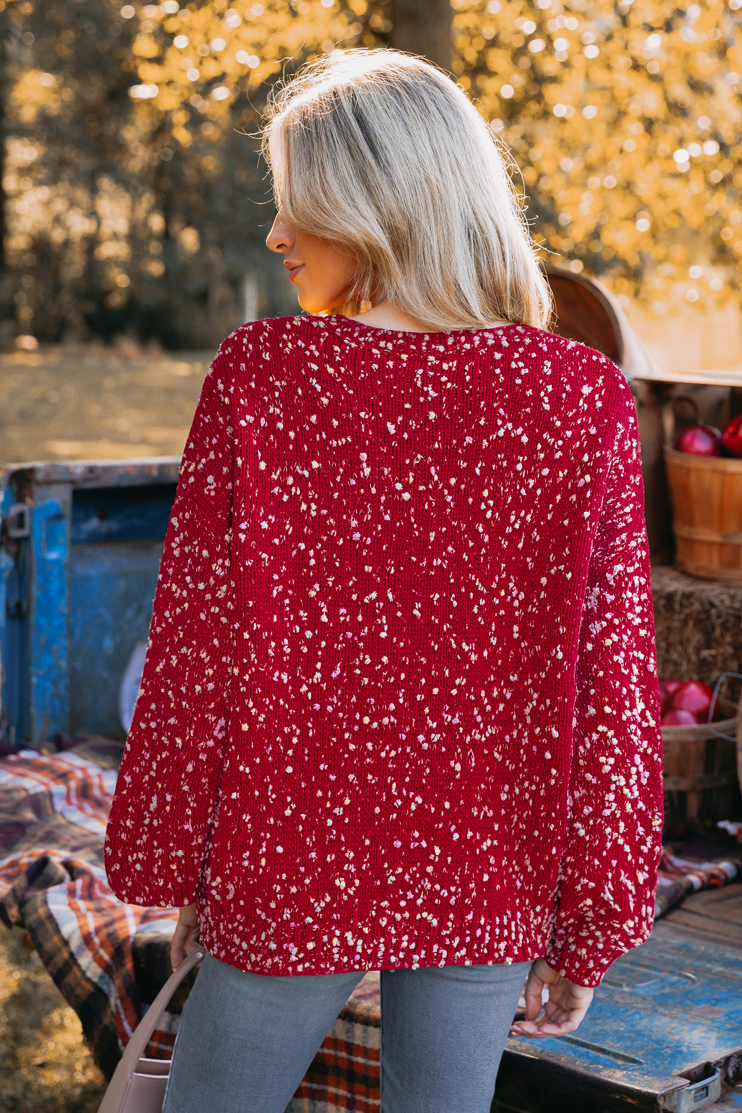]Il maglione rosso coriandoli porta un'energia frizzante e giocosa in ogni occasione! Presenta uno scollo rotondo e maniche lunghe per un look comodo.