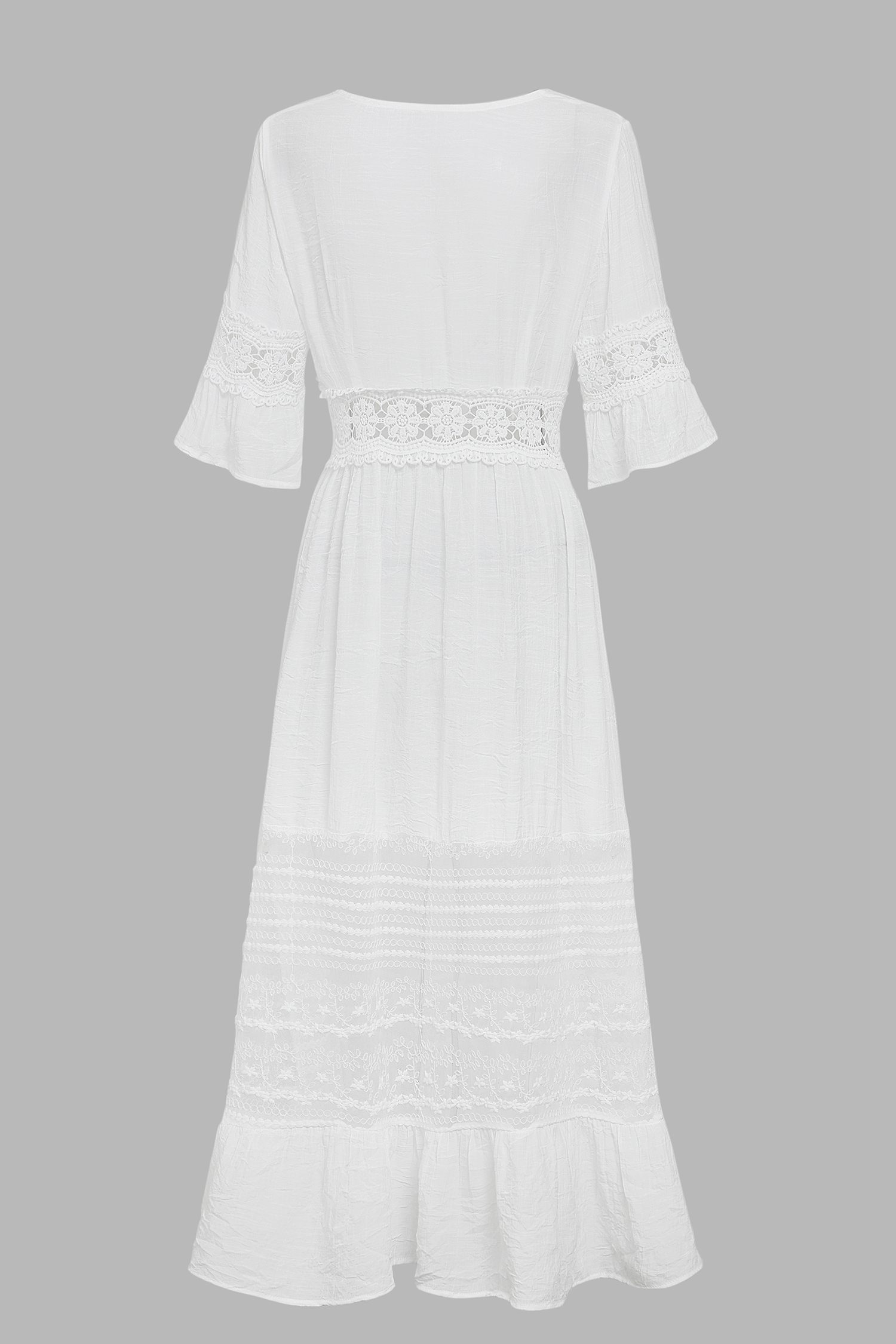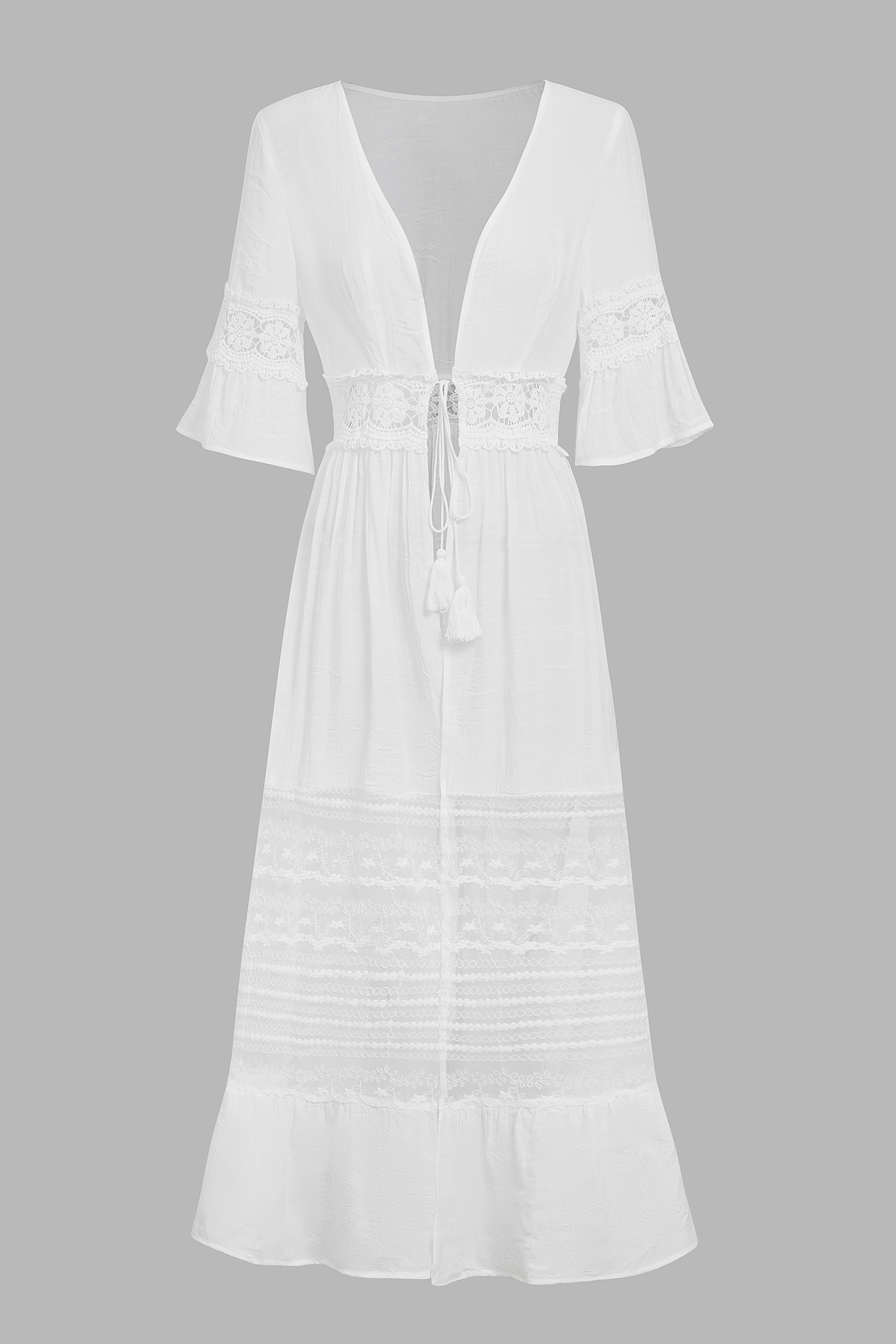 Sentiti sognante con il Lace Cover-Up Maxi Dress! Con una profonda scollatura, mezze maniche e chiusura frontale con lacci, questo vestito presenta pannelli in pizzo e un orlo arricciato che creano una silhouette morbida e femminile, perfetta per ogni occasione.