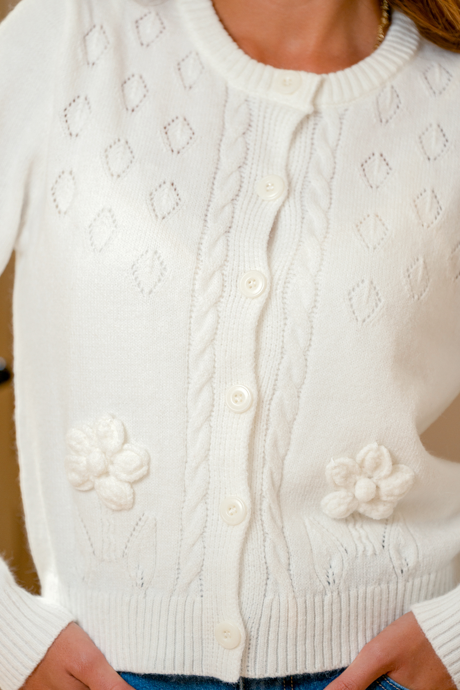 Il cardigan bianco Floral Agenda è perfetto per tutti i tuoi progetti, con scollo rotondo, bottoni sul davanti e maniche lunghe con morbidi fiori in maglia che aggiungono un tocco di fascino.