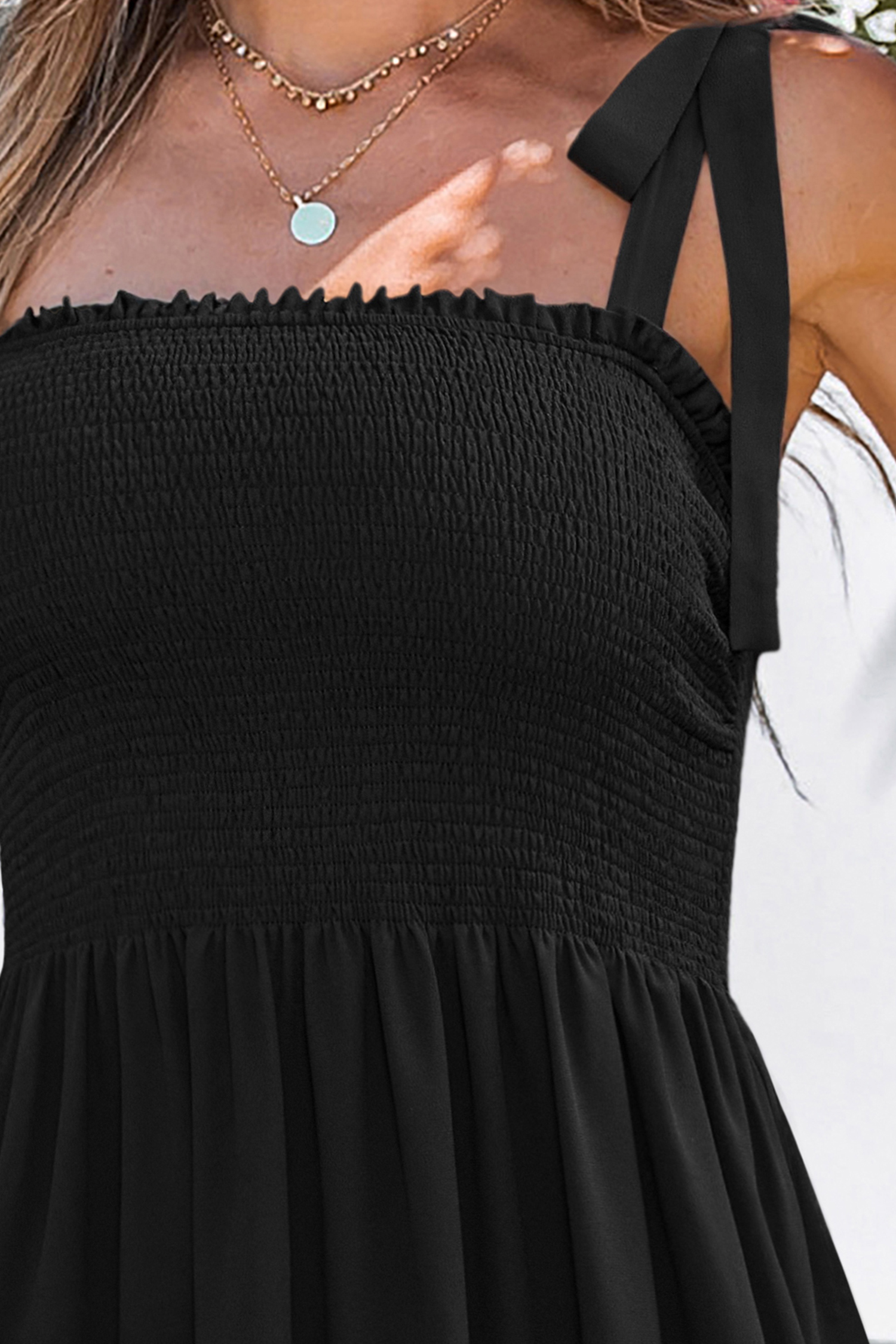 L'abito lungo nero Flourish coniuga un'eleganza senza tempo con una disinvolta semplicità! La scollatura quadrata e il taglio senza maniche lo rendono pulito e raffinato, mentre il corpetto arricciato e la lunghezza fluida del maxi abito aggiungono texture e movimento per un look raffinato, perfetto per tutto il giorno.