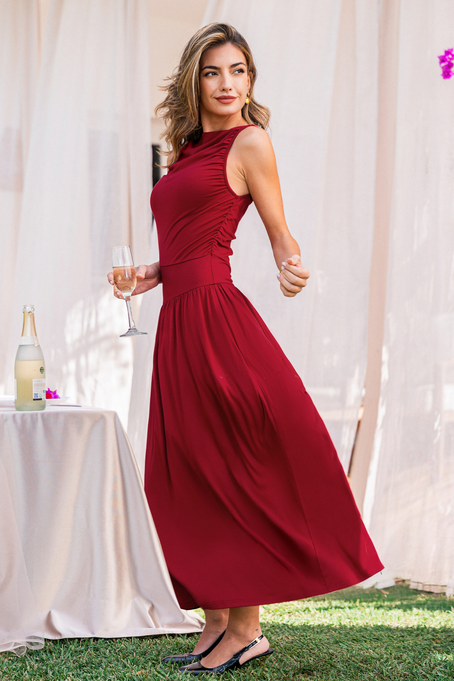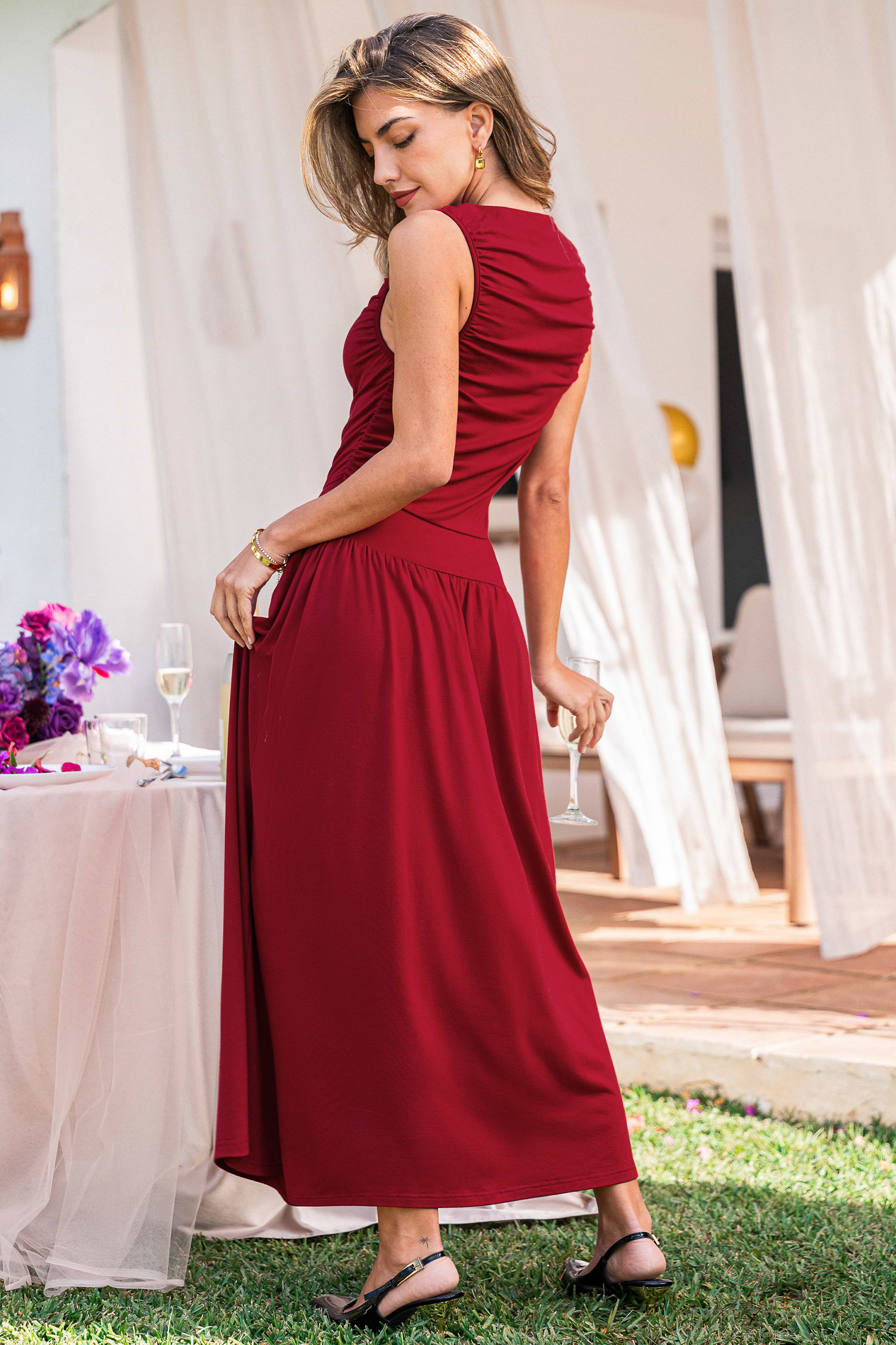 Il vestito lungo rosso Gala è elegante e scenografico, perfetto per un ingresso di classe! Il design senza maniche con scollo a barca e la lunghezza fluida creano una silhouette sorprendentemente sofisticata.