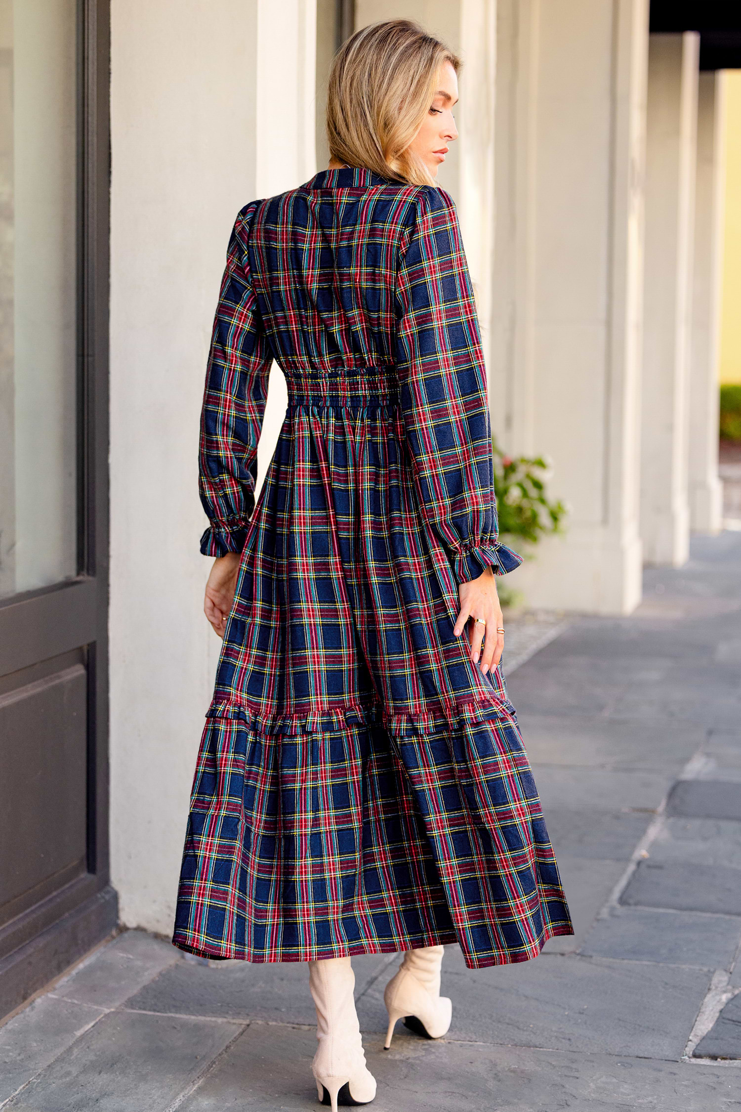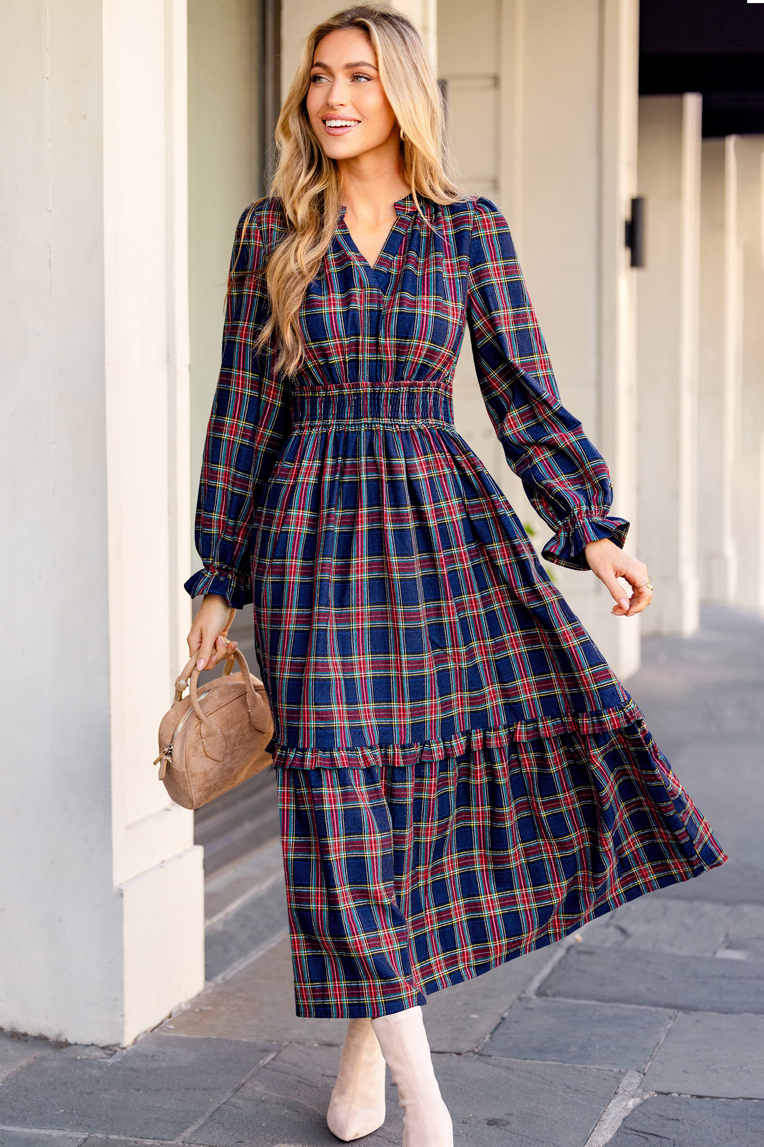 Il maxi abito scozzese Going Places è perfetto per muoversi senza sforzo! Le maniche lunghe con scollo a V e la lunghezza fluida lo rendono perfetto per le giornate che richiedono un look rilassato.