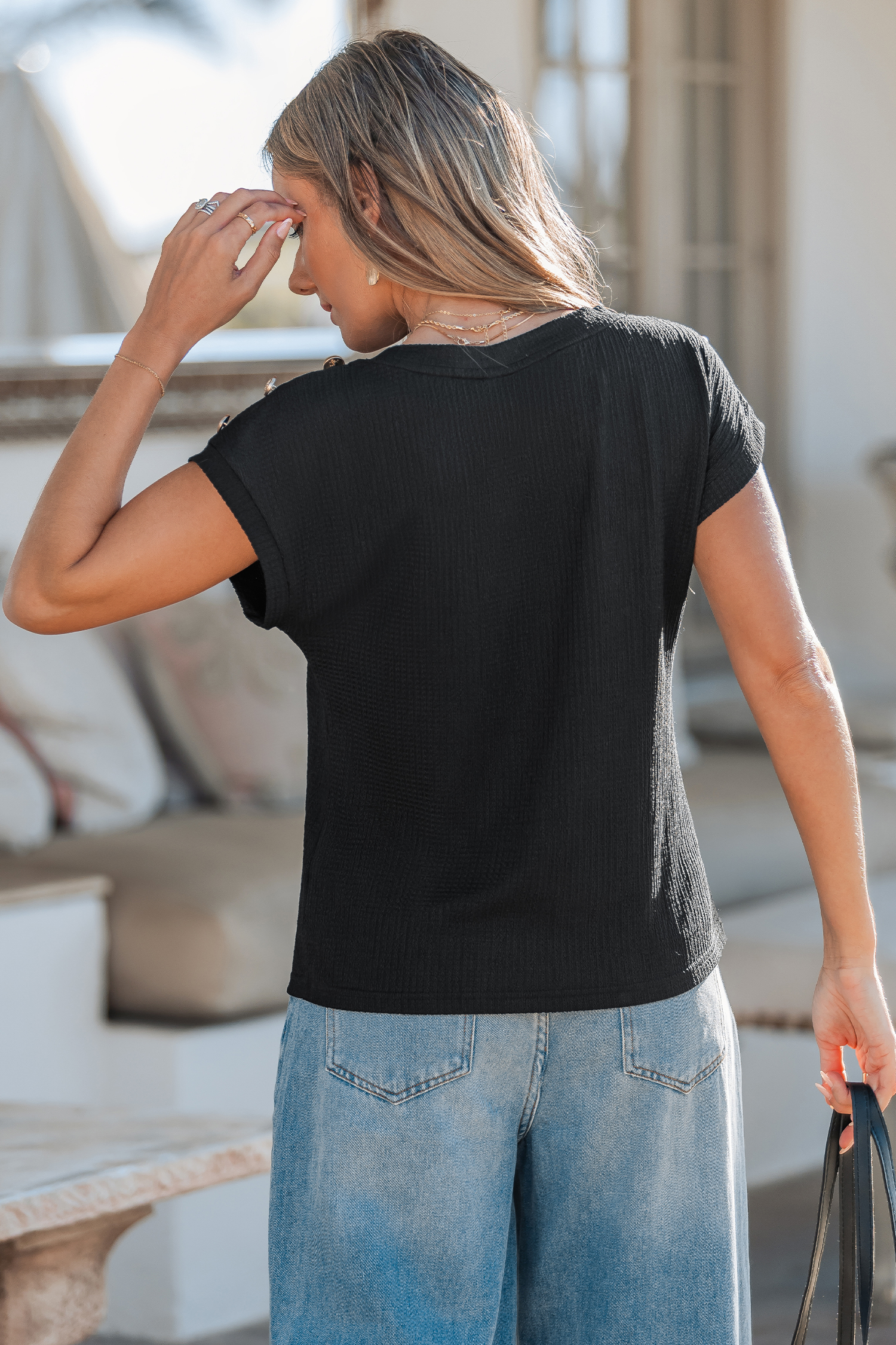 Il top nero In Rotation è un must have del guardaroba! Lo scollo rotondo, le maniche corte e i finti bottoni lo rendono un capo essenziale per tutti i giorni.