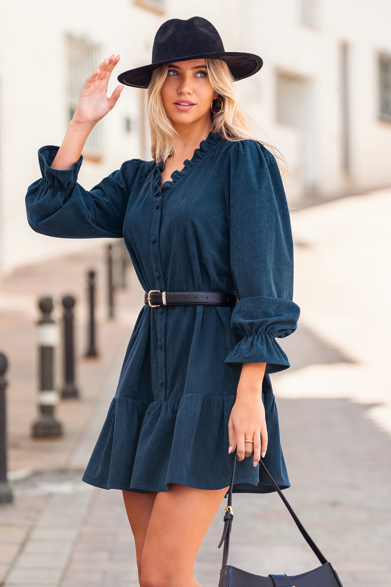 Il mini abito Juniper Blue è pieno di energia civettuola e stravagante! Presenta maniche lunghe con scollo a V e volant per un tocco femminile e giocoso.