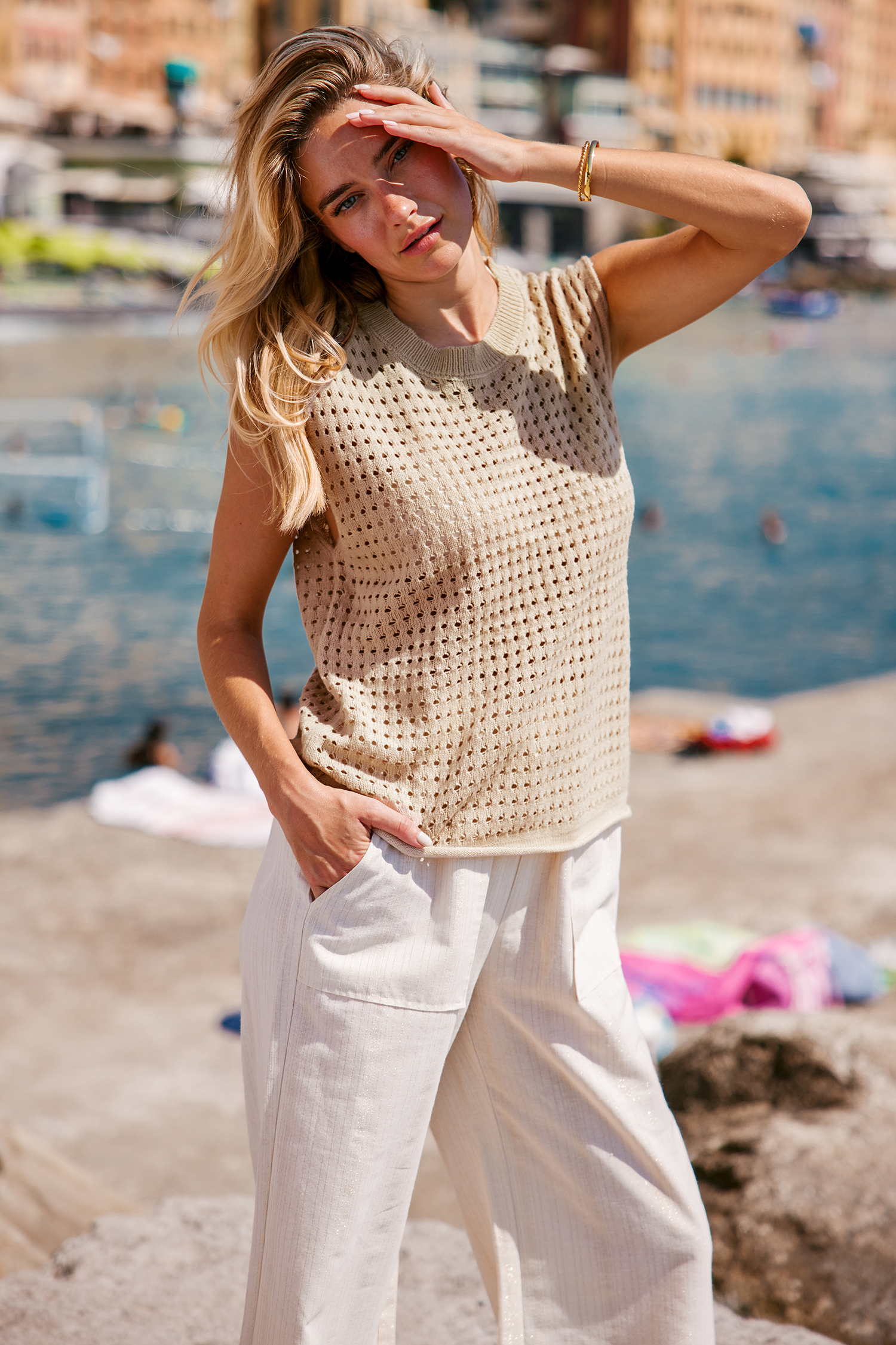 Maglietta muscolare all'uncinetto con scollo rotondo color cachi