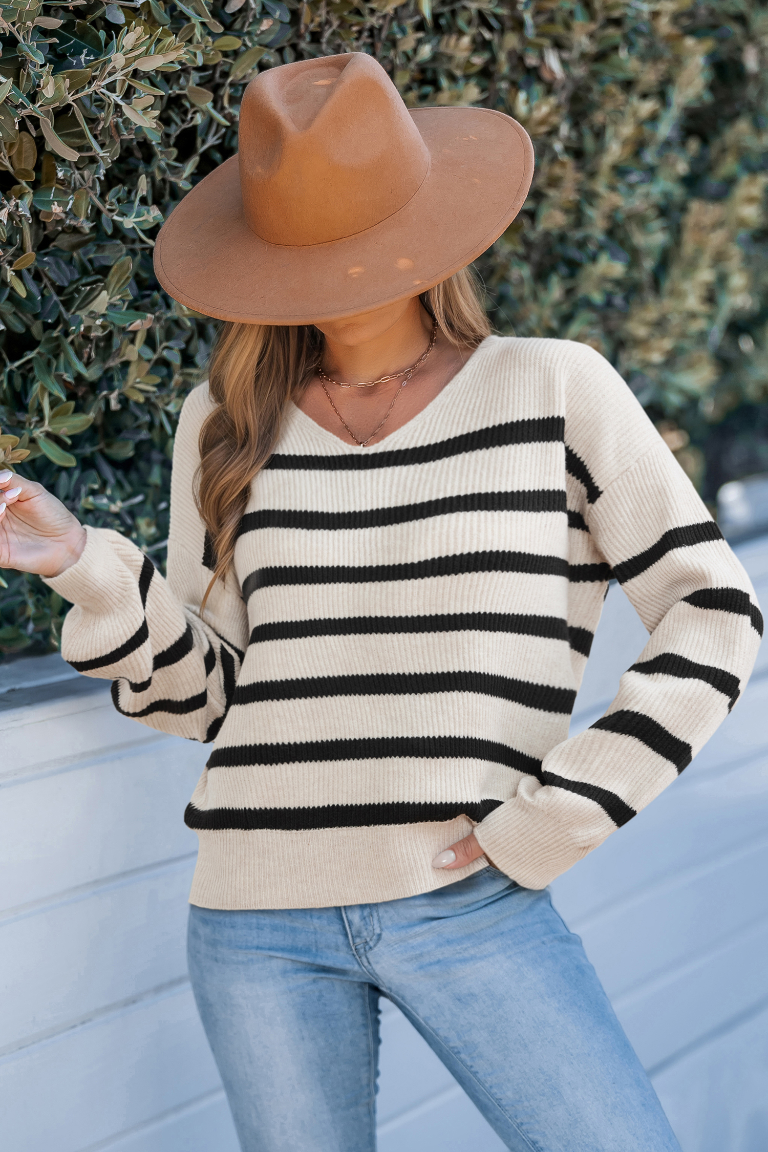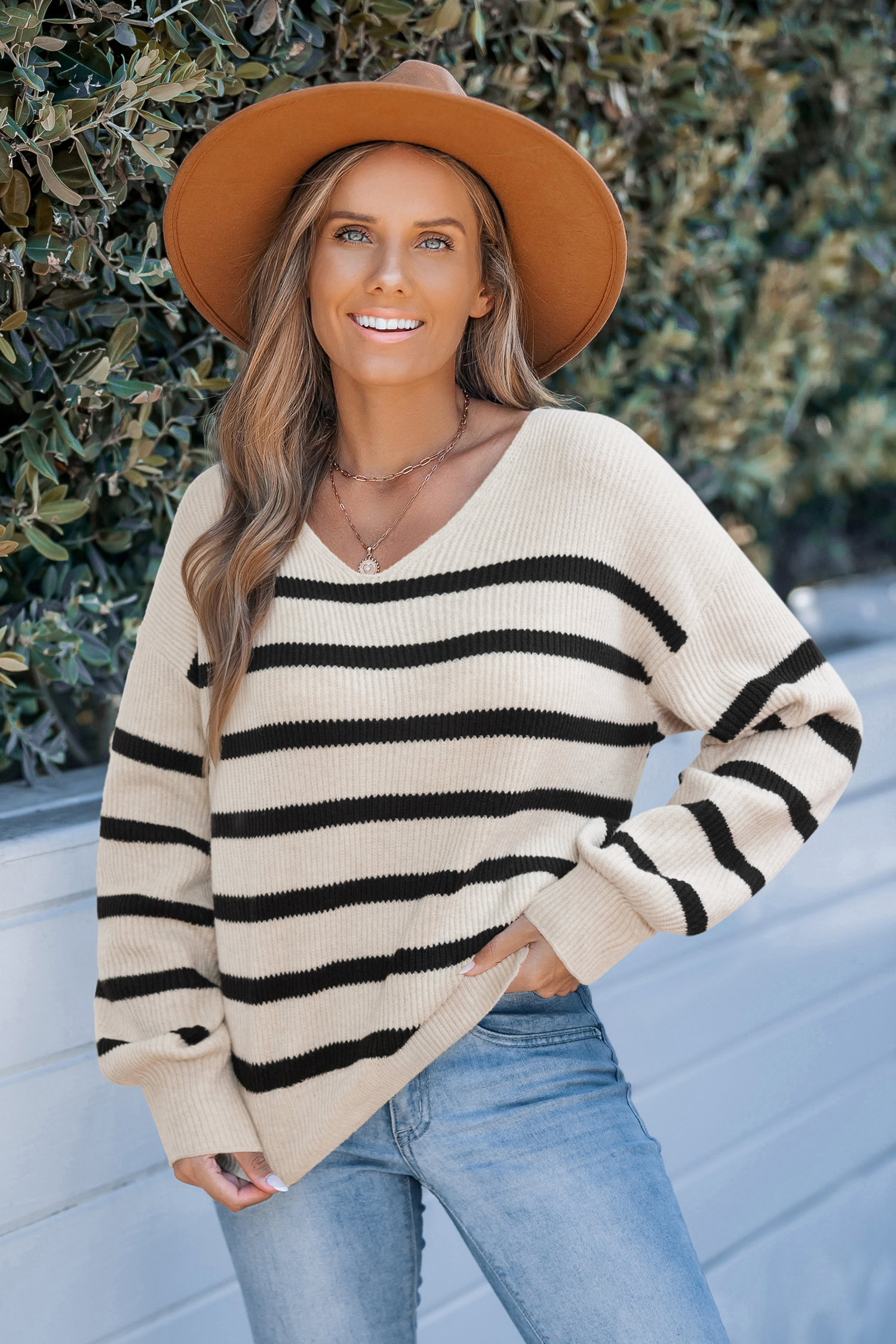 Il maglione a righe Little Comforts regala un'atmosfera rilassata e accogliente con un tocco femminile e giocoso! Le maniche lunghe con scollo a V e il fiocco aggiungono fascino, rendendolo perfetto per le giornate fresche e per i look a strati.