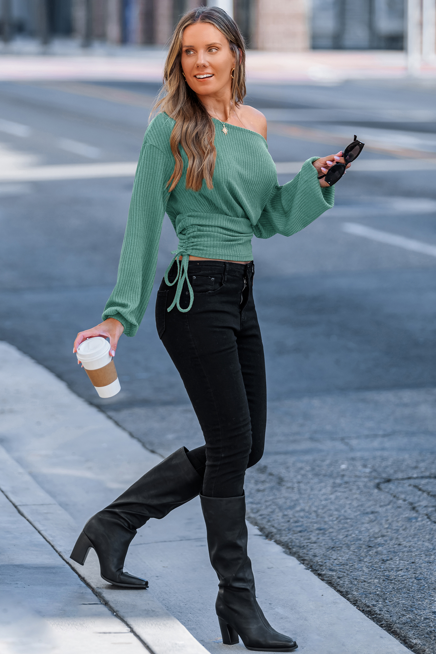 Il top verde Little Secrets è femminile e sbarazzino allo stesso tempo! La scollatura asimmetrica, le maniche lunghe e il dettaglio annodato lo rendono una scelta divertente per i look da giorno e da sera.