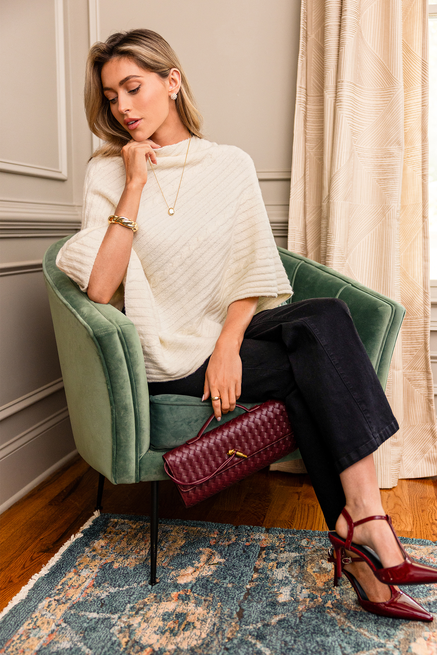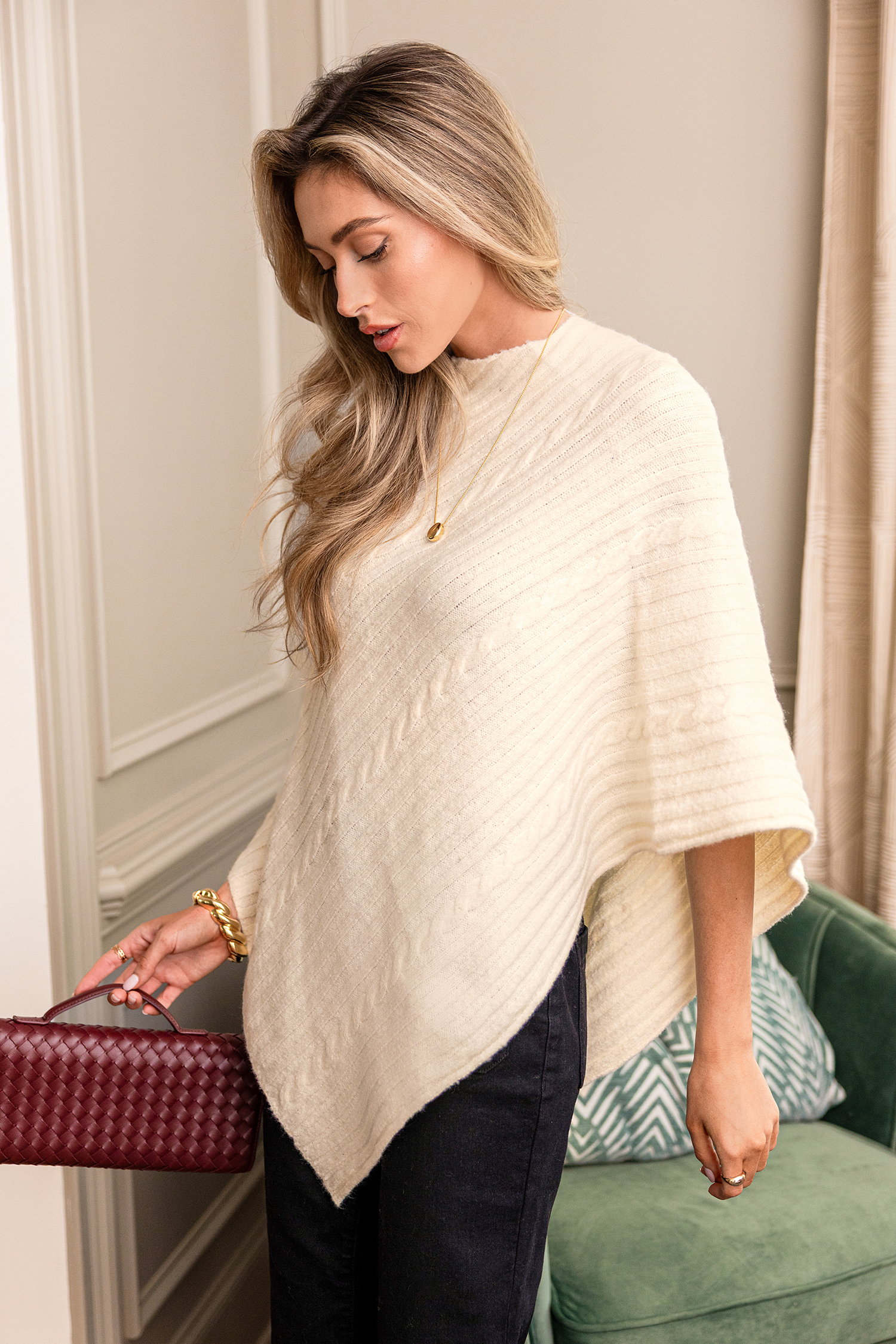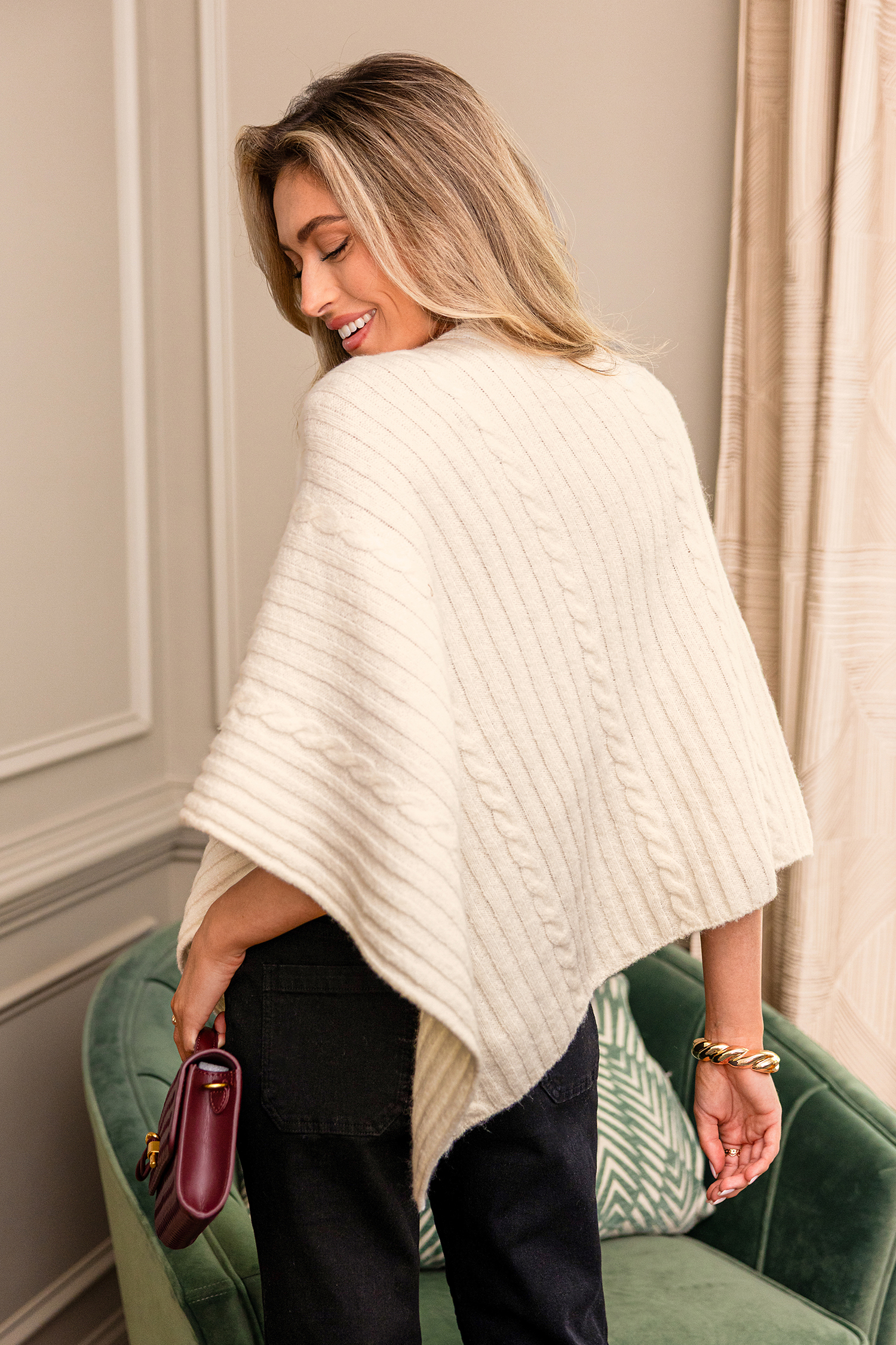 Il maglione poncho bianco Mademoiselle è perfetto per un look sofisticato! Con scollo rotondo, maniche lunghe e orlo a fazzoletto, è una scelta comoda per un look a strati con stile.