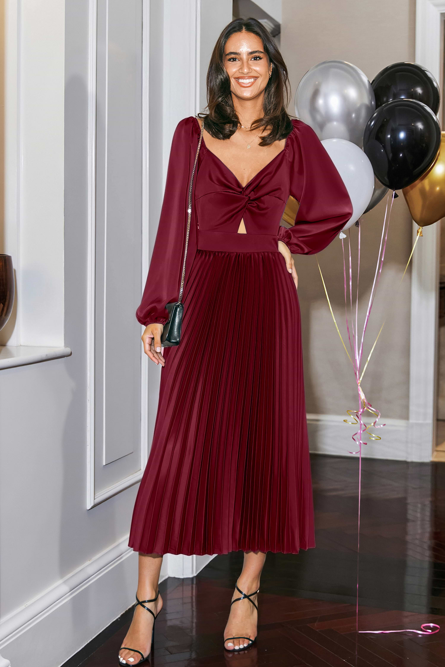 L'abito midi rosso Midnight Tango è perfetto per rubare la scena! Con maniche lunghe con scollo a V e lunghezza midi plissettata, regala un'energia giocosa e civettuola a ogni passo.
