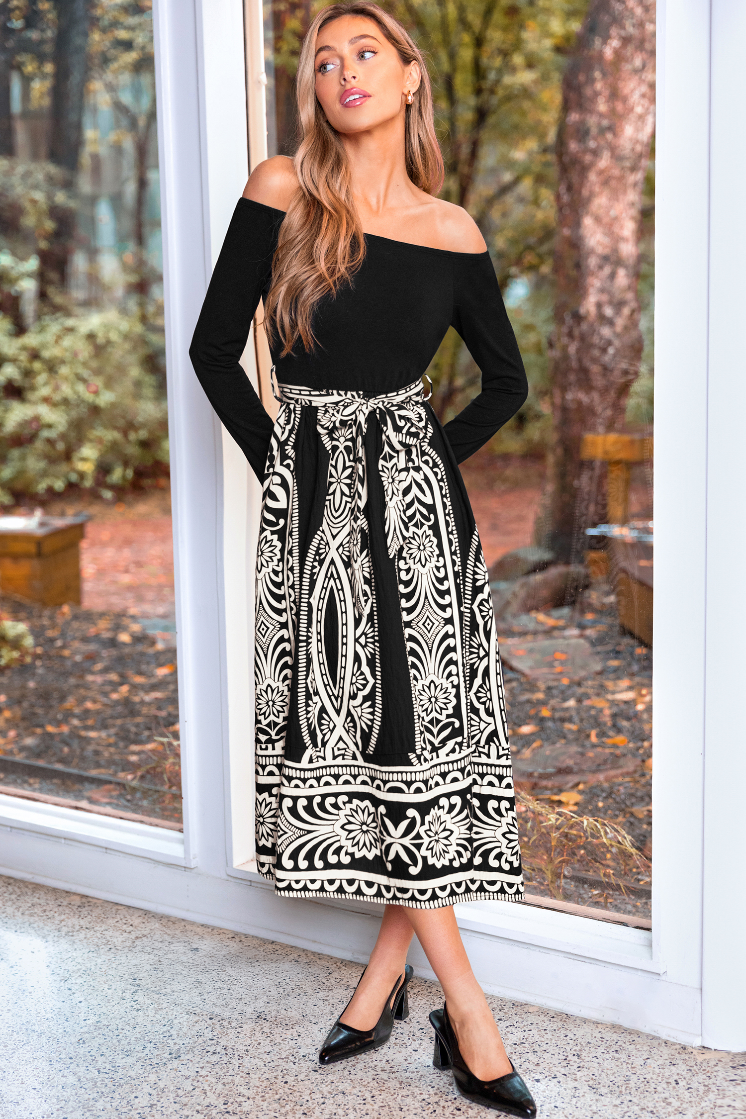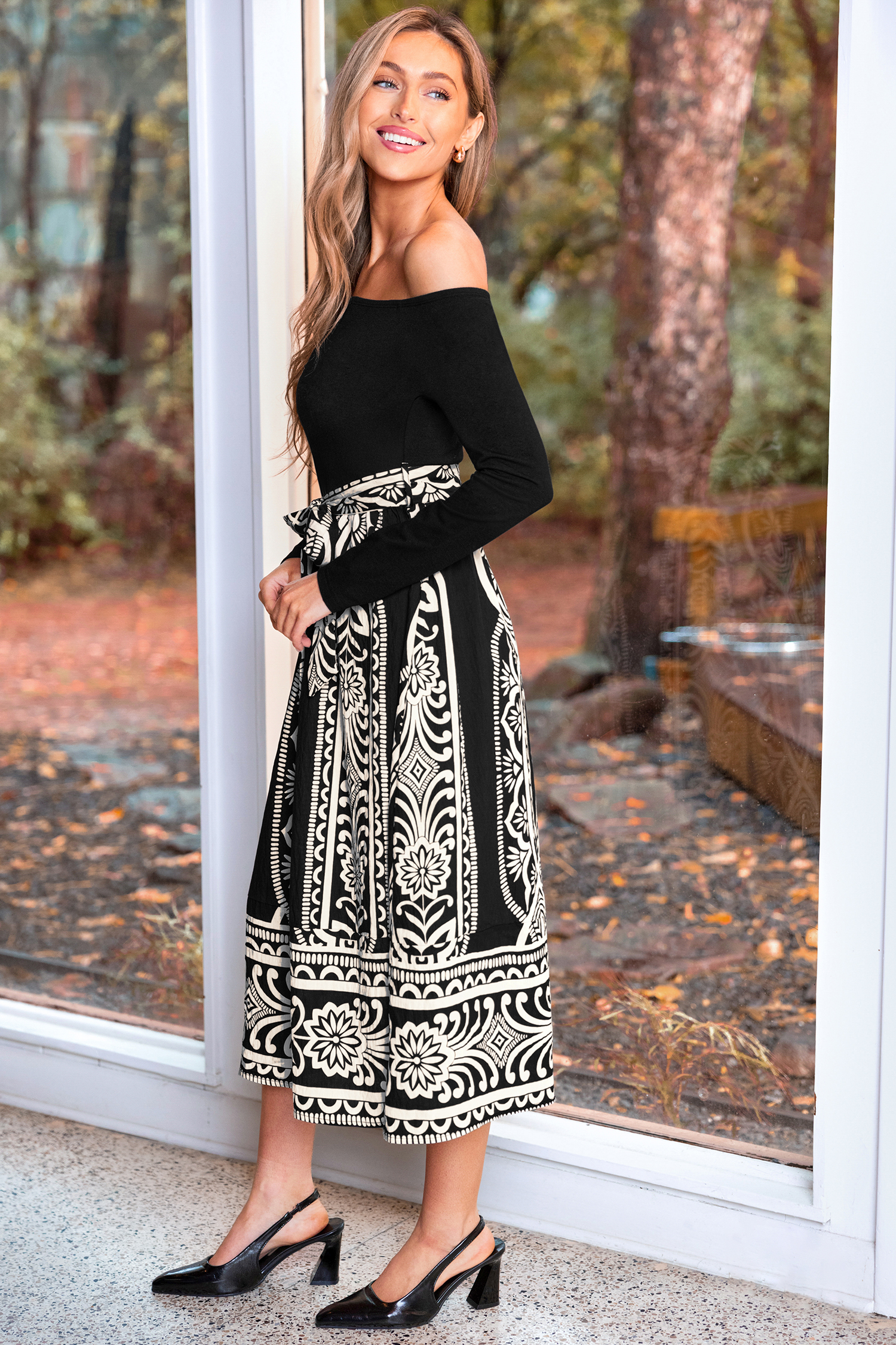 L'abito midi decorato Minimalist Moment sfoggia un look semplice e sobrio con un tocco di teatralità! La scollatura a spalle scoperte, le maniche lunghe, il laccetto in vita e la lunghezza midi si uniscono per un look fresco, lusinghiero e facile da abbinare.