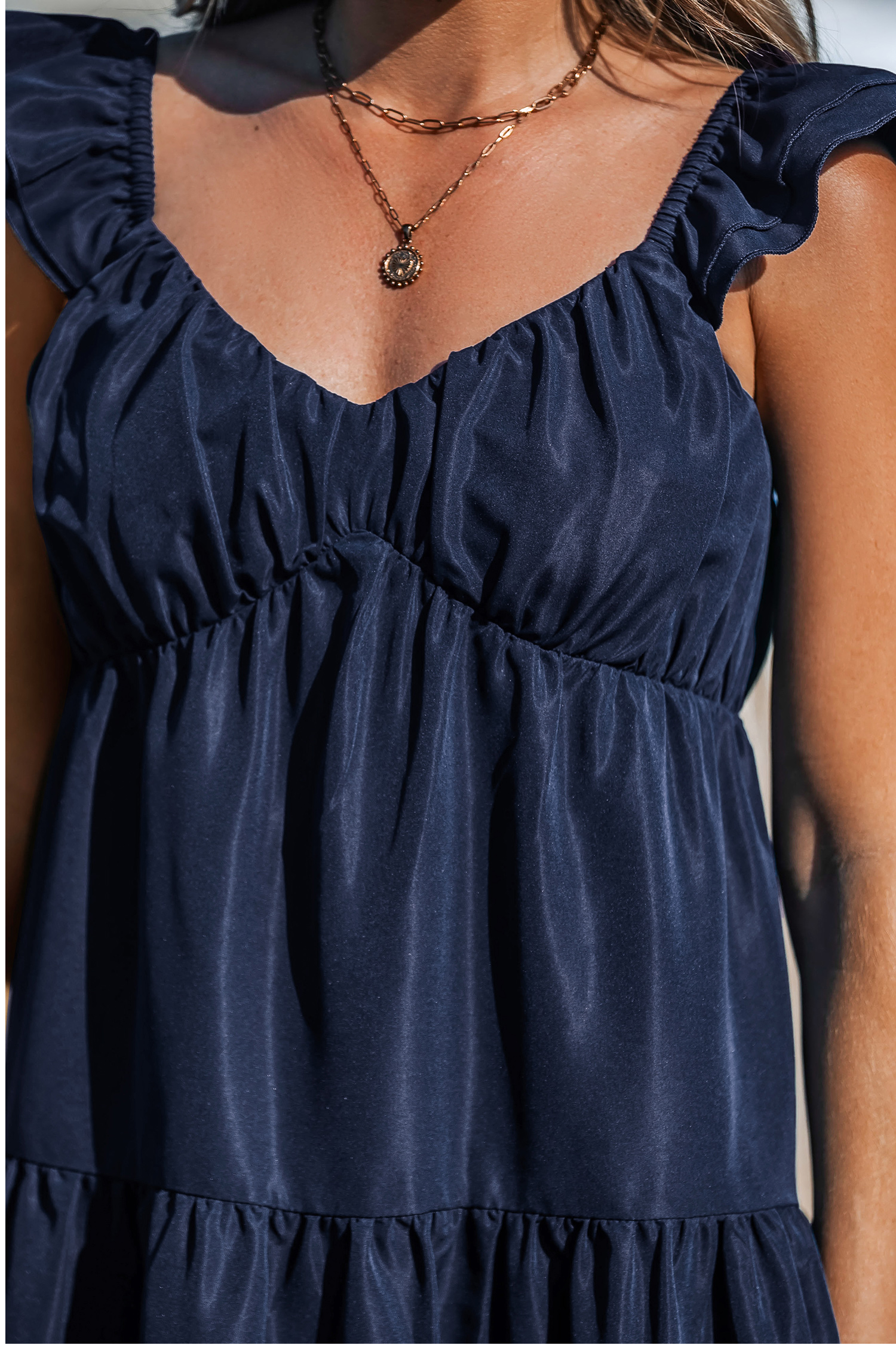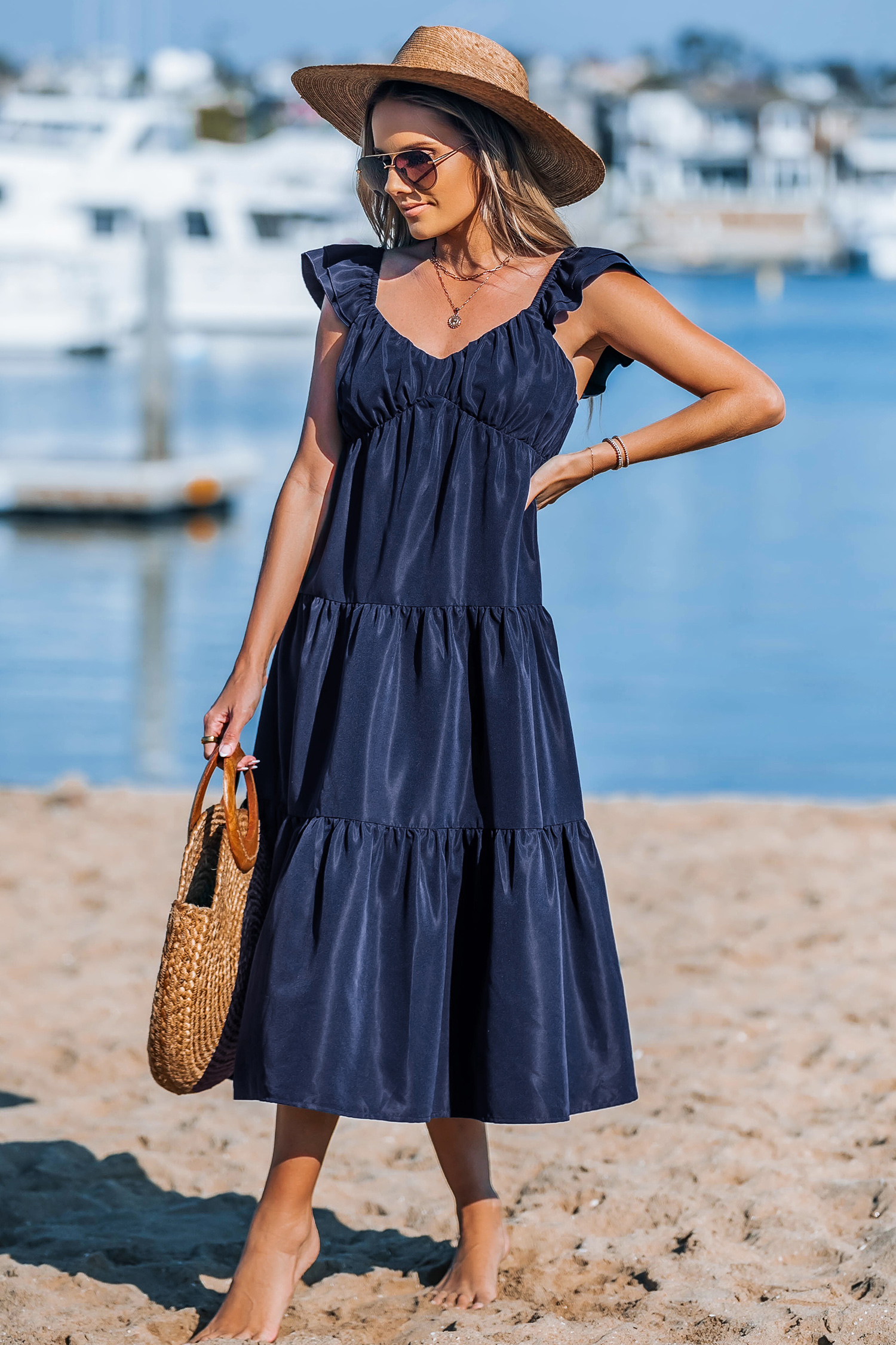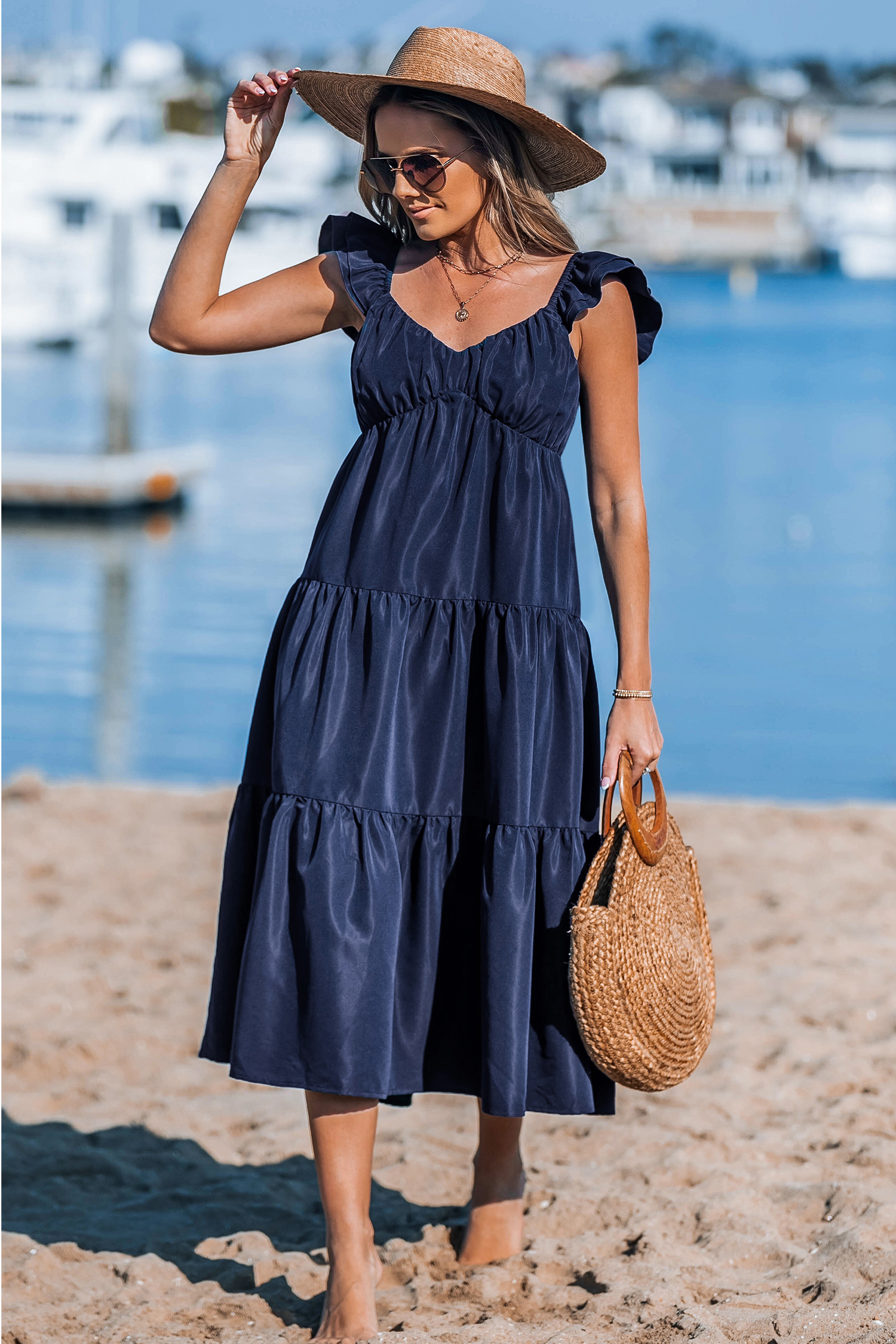 Innamorati del vestito midi con scollo a cuore blu navy! Con le sue romantiche maniche a palloncino con scollo a cuore e orlo arricciato, questo vestito unisce senza sforzo comfort e femminilità per ogni occasione.