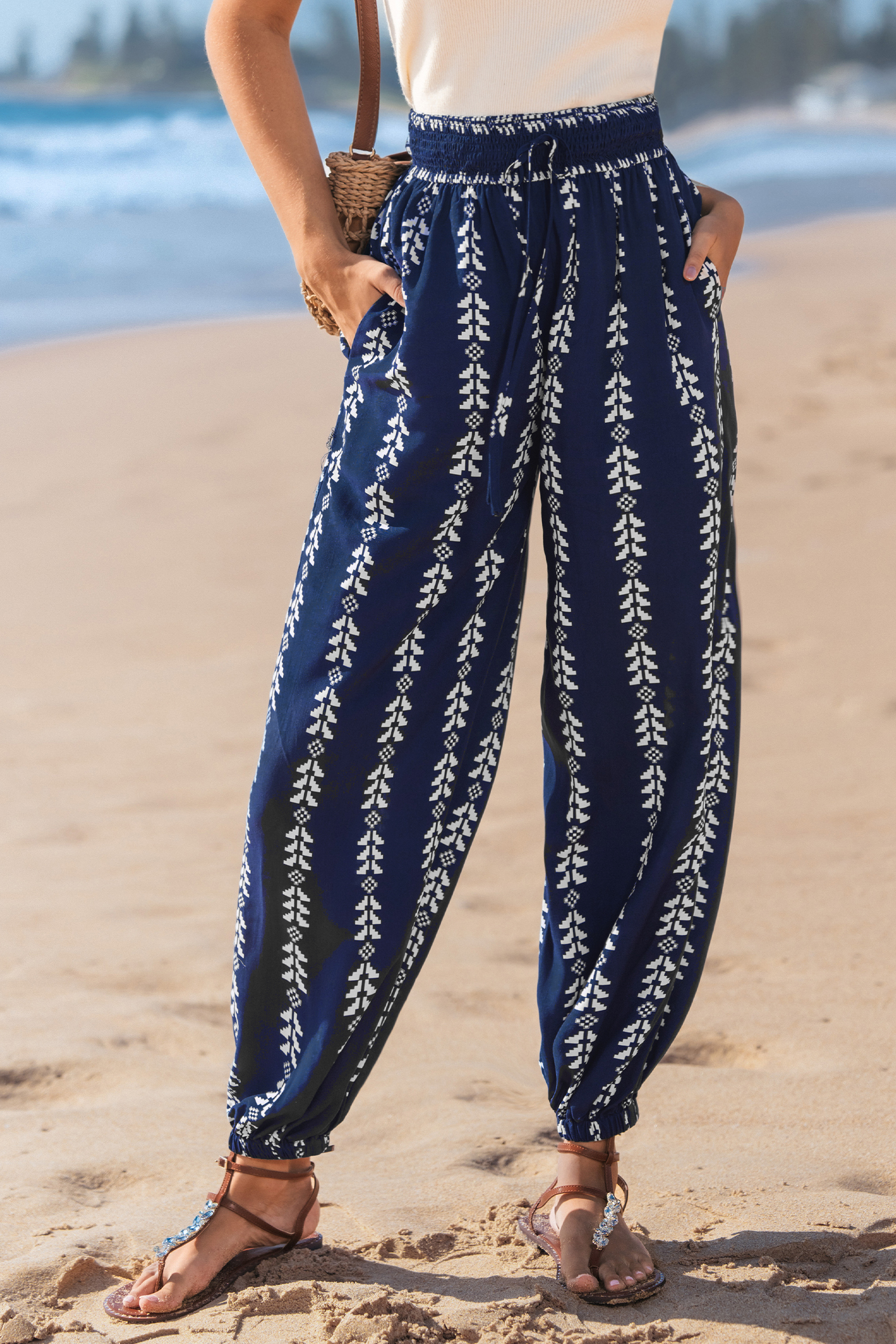 I pantaloni Navy Boho Tapered Cover-Up Pants sono tutti incentrati su uno stile rilassato e disinvolto. Con una vita elasticizzata e una gamba affusolata, questi pantaloni sono perfetti per un look rilassato pronto per la spiaggia.