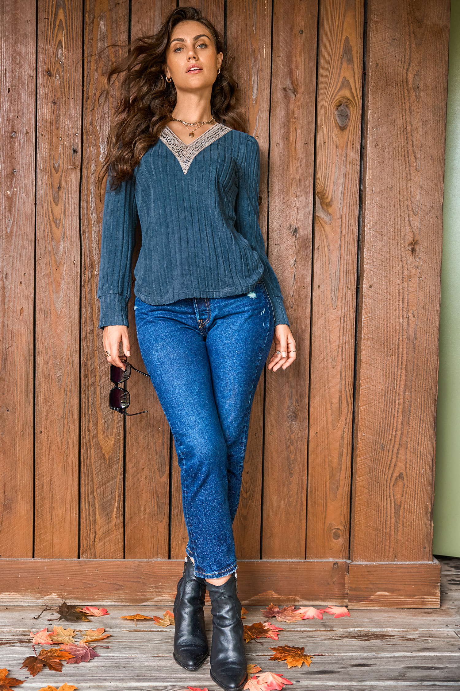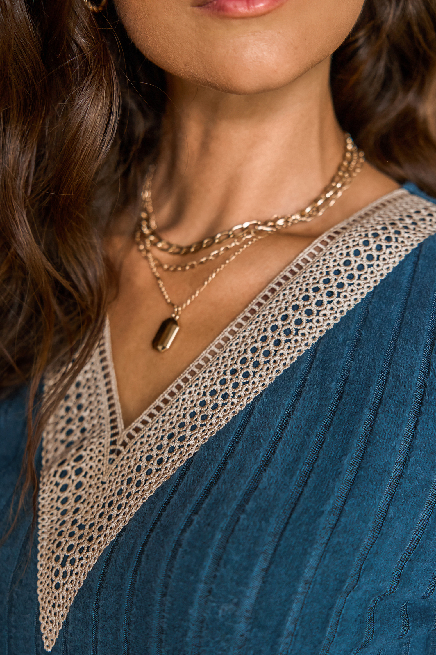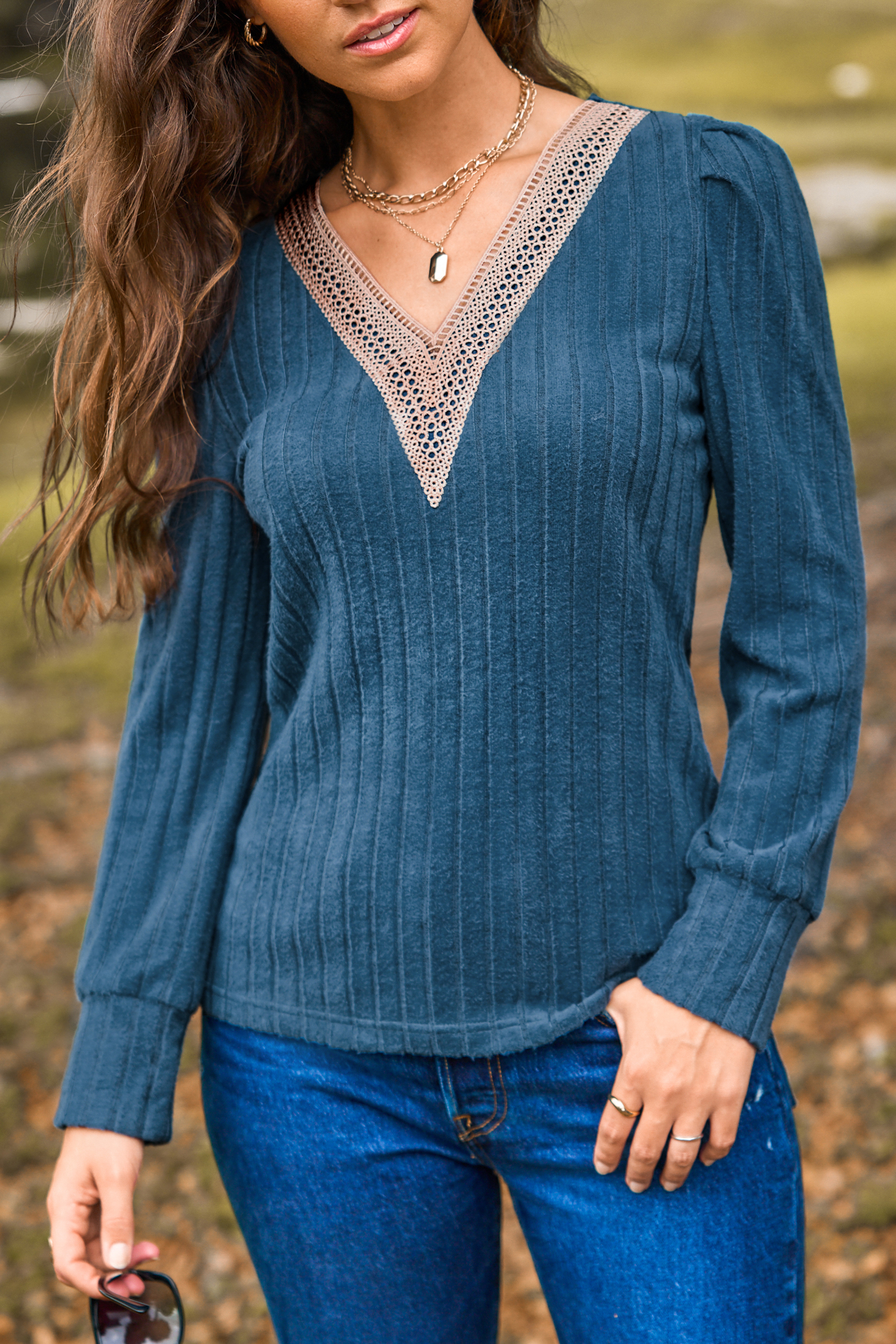Top a maniche lunghe con scollo a V e spalle a sbuffo in pizzo blu navy