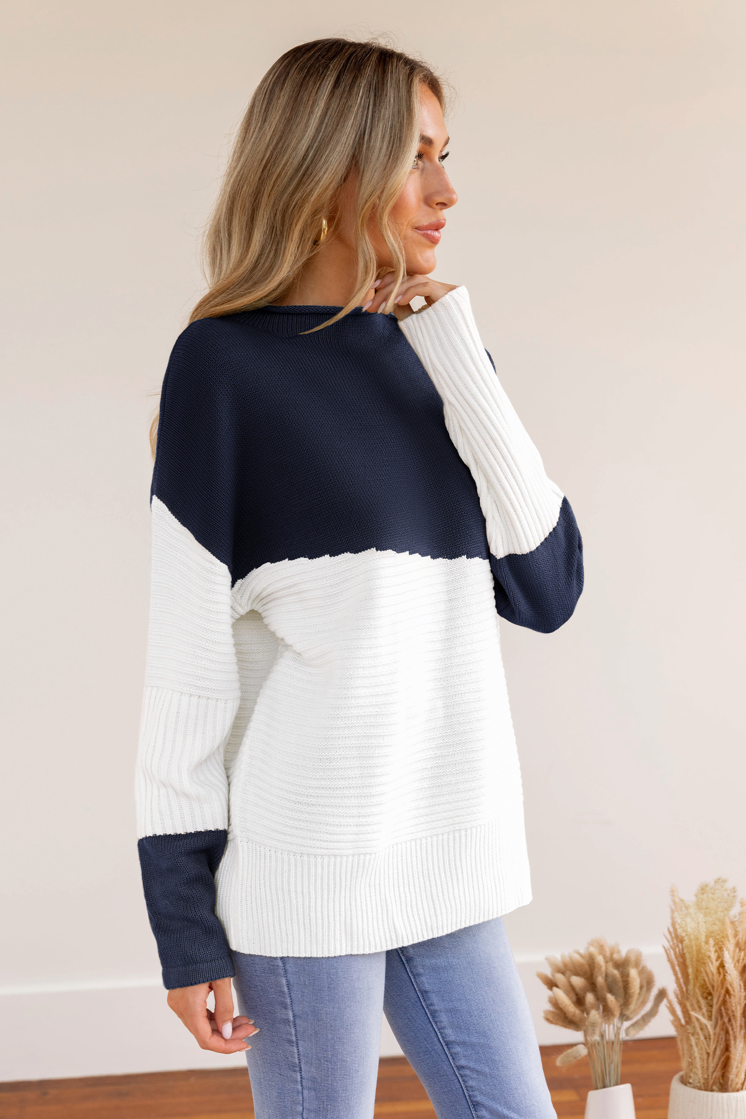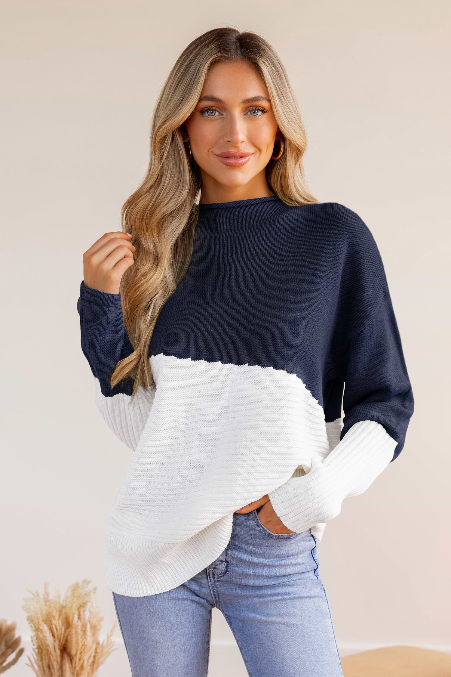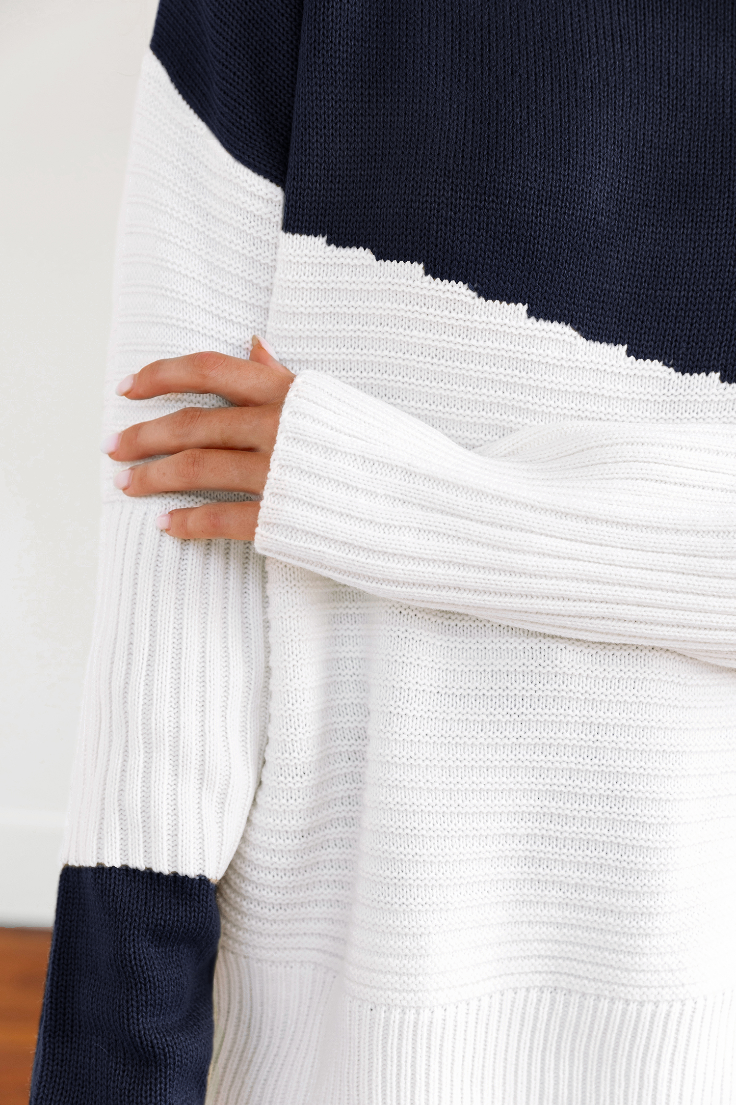 Maglione a collo alto asimmetrico colorblock blu navy e bianco