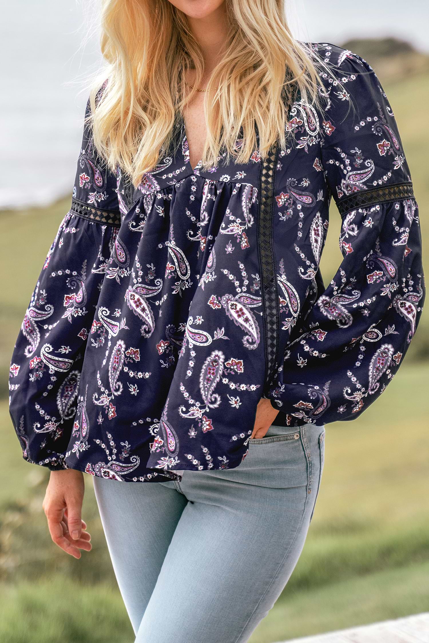 Top in pizzo a contrasto con maniche a sbuffo e scollo a V Paisley