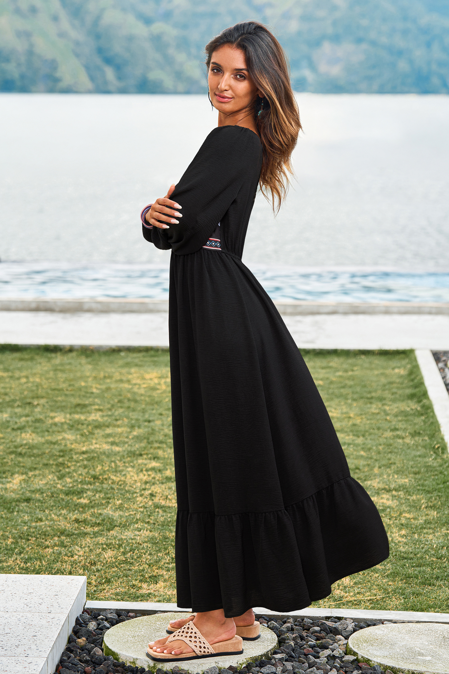 L'immagine Questo abito lungo floreale è perfetto per giornate da sogno e ore d'oro! Con scollo a barchetta, maniche lunghe e una silhouette ampia, è pura energia da protagonista.