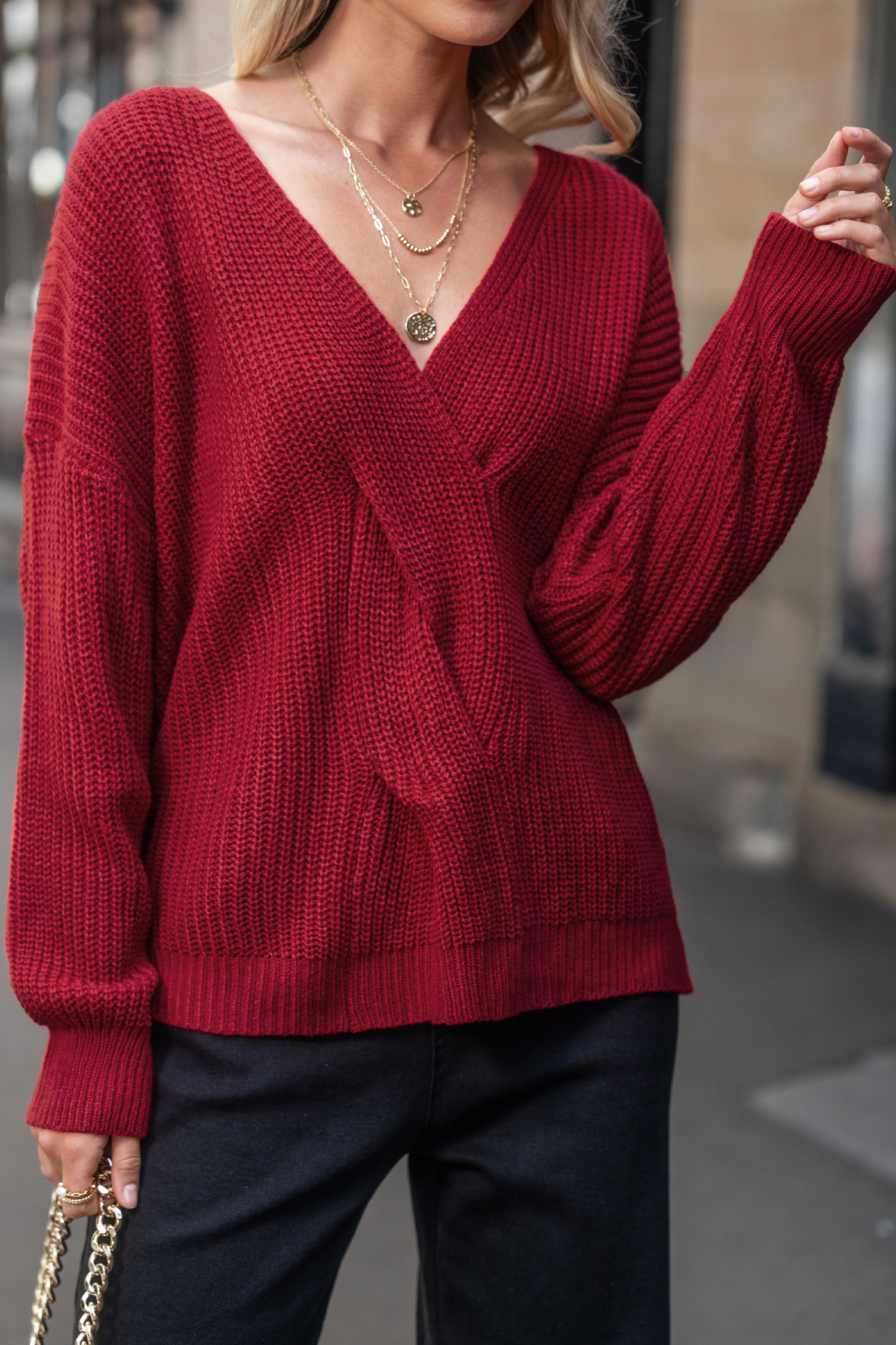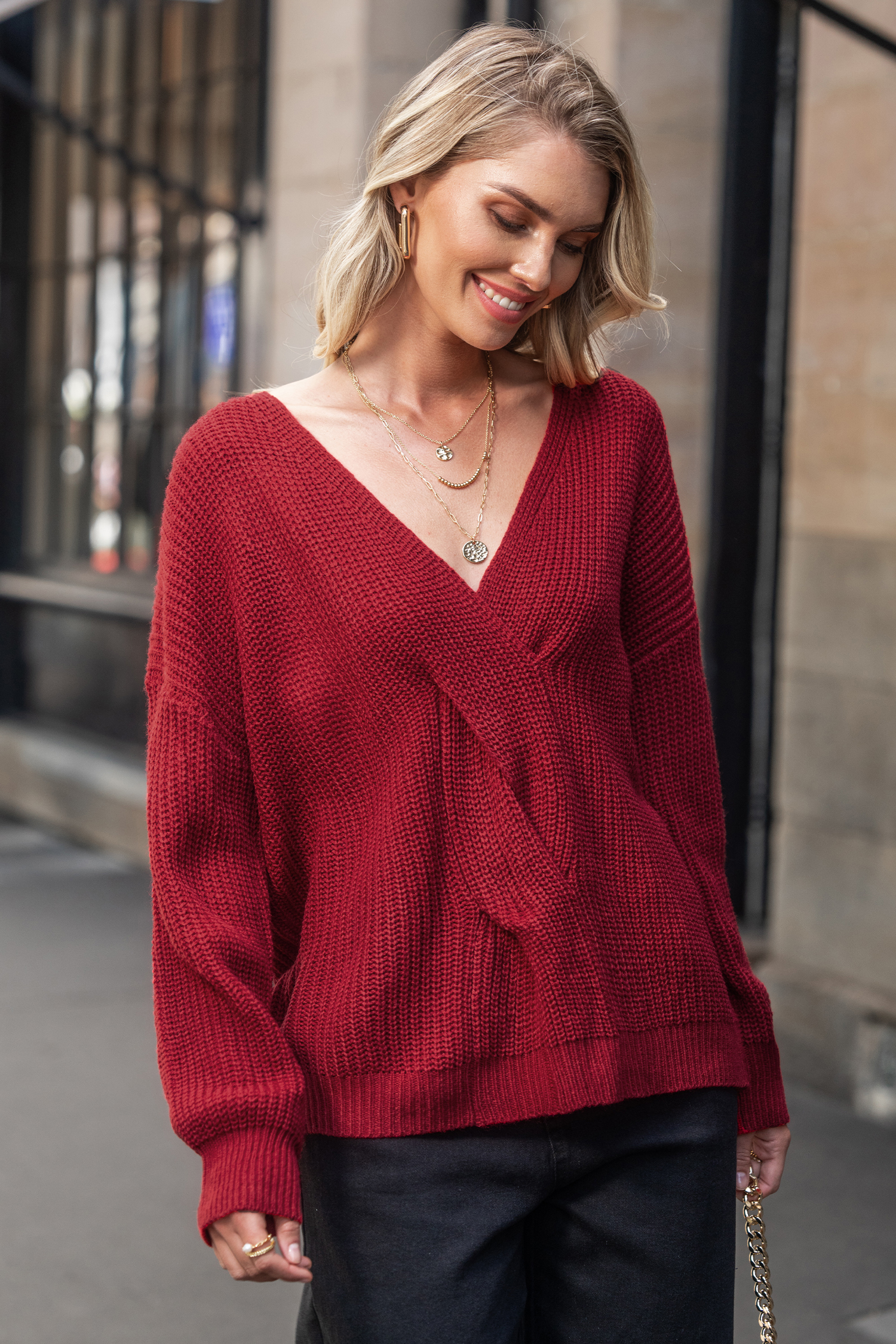Il maglione rosso a maniche lunghe con scollo a V e intreccio unisce una comoda maglia a un'elegante spalla scesa e un dettaglio frontale intrecciato. È il capo perfetto per esaltare il tuo look rilassato, mantenendoti al caldo e favoloso!