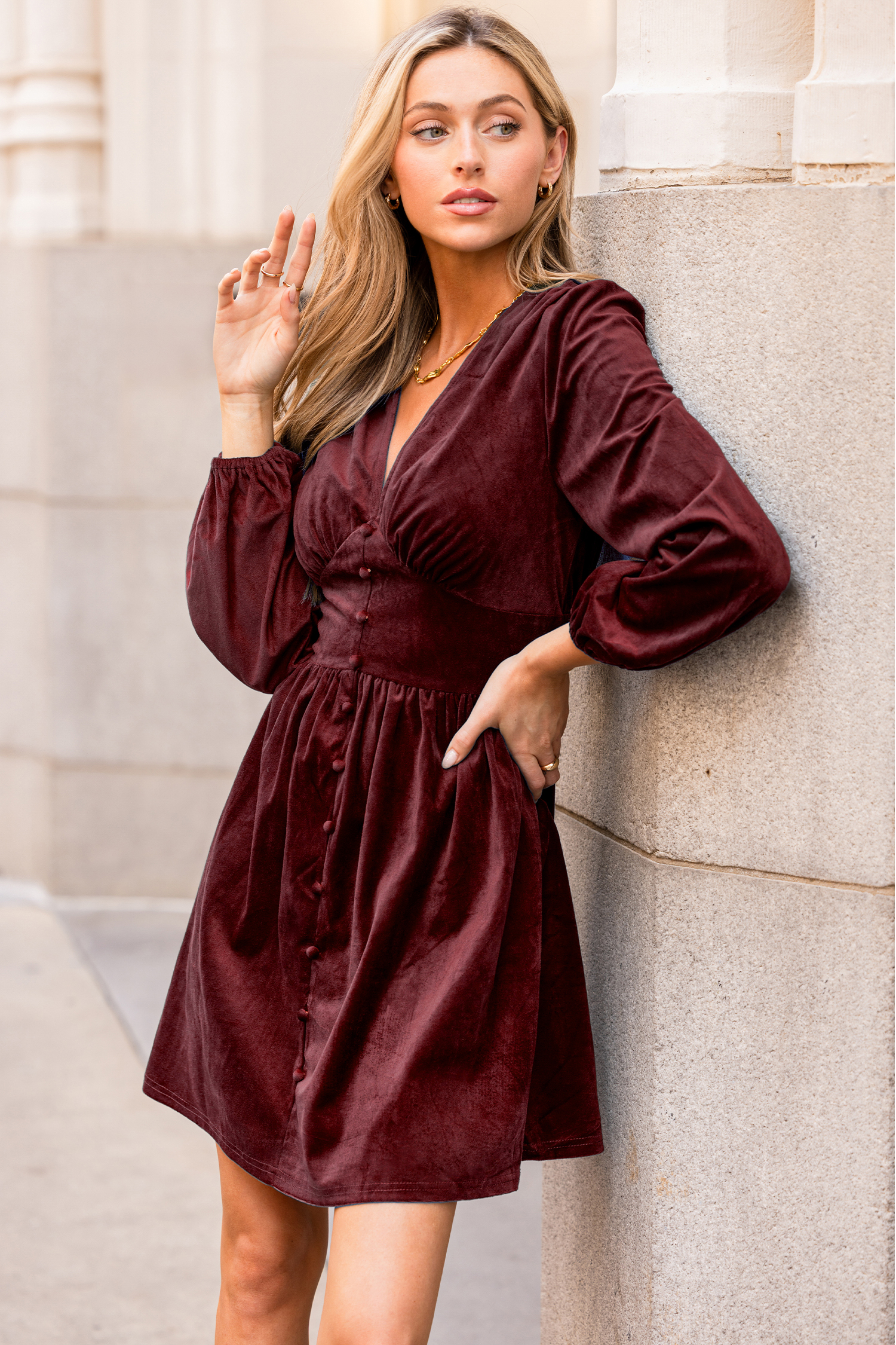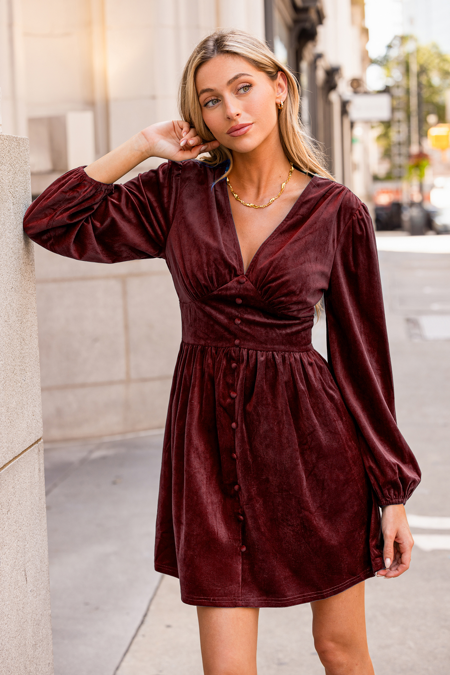 Il mini abito rosso Second Date sa come mantenere il fascino! Le maniche lunghe con scollo a V e la lunghezza mini lo rendono il mix perfetto tra civettuolo e classico.