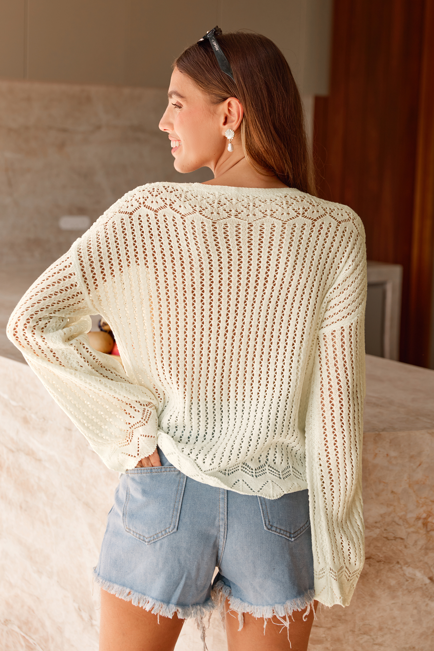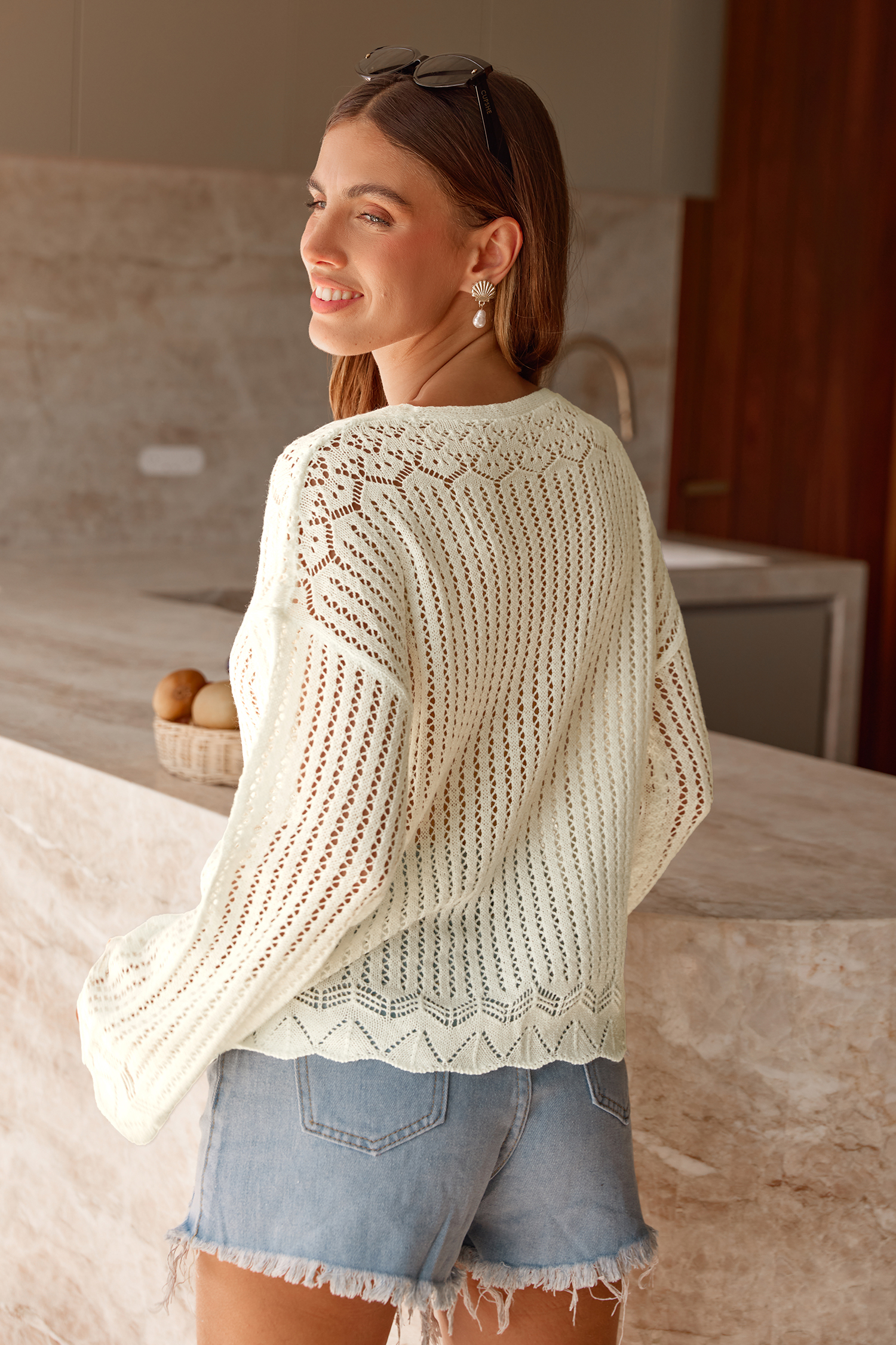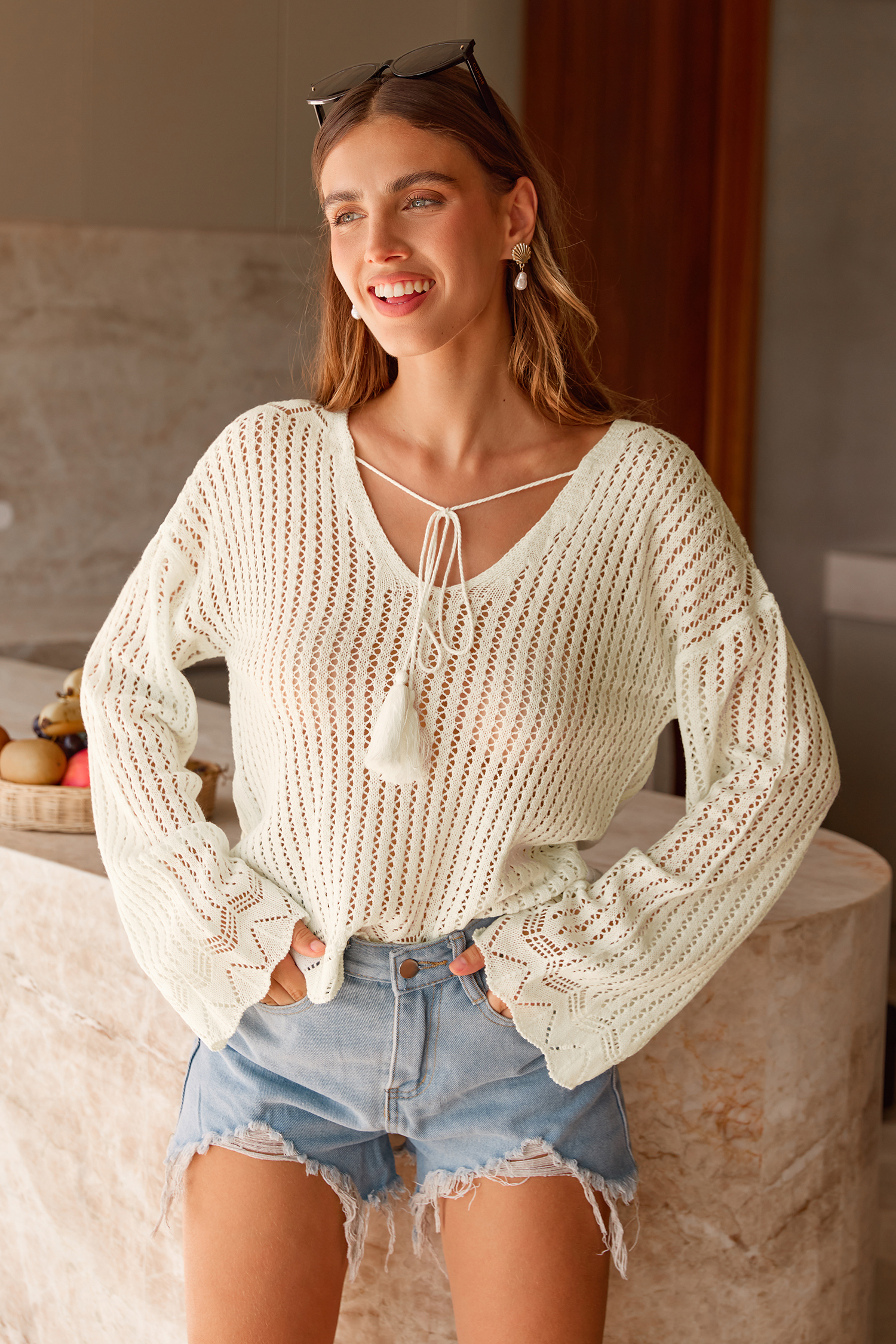 Il top in maglia beige Sweet Foam è tutto un concentrato di energia morbida e accogliente! Lo scollo a V e le maniche lunghe lo rendono comodo e adatto a qualsiasi occasione casual.