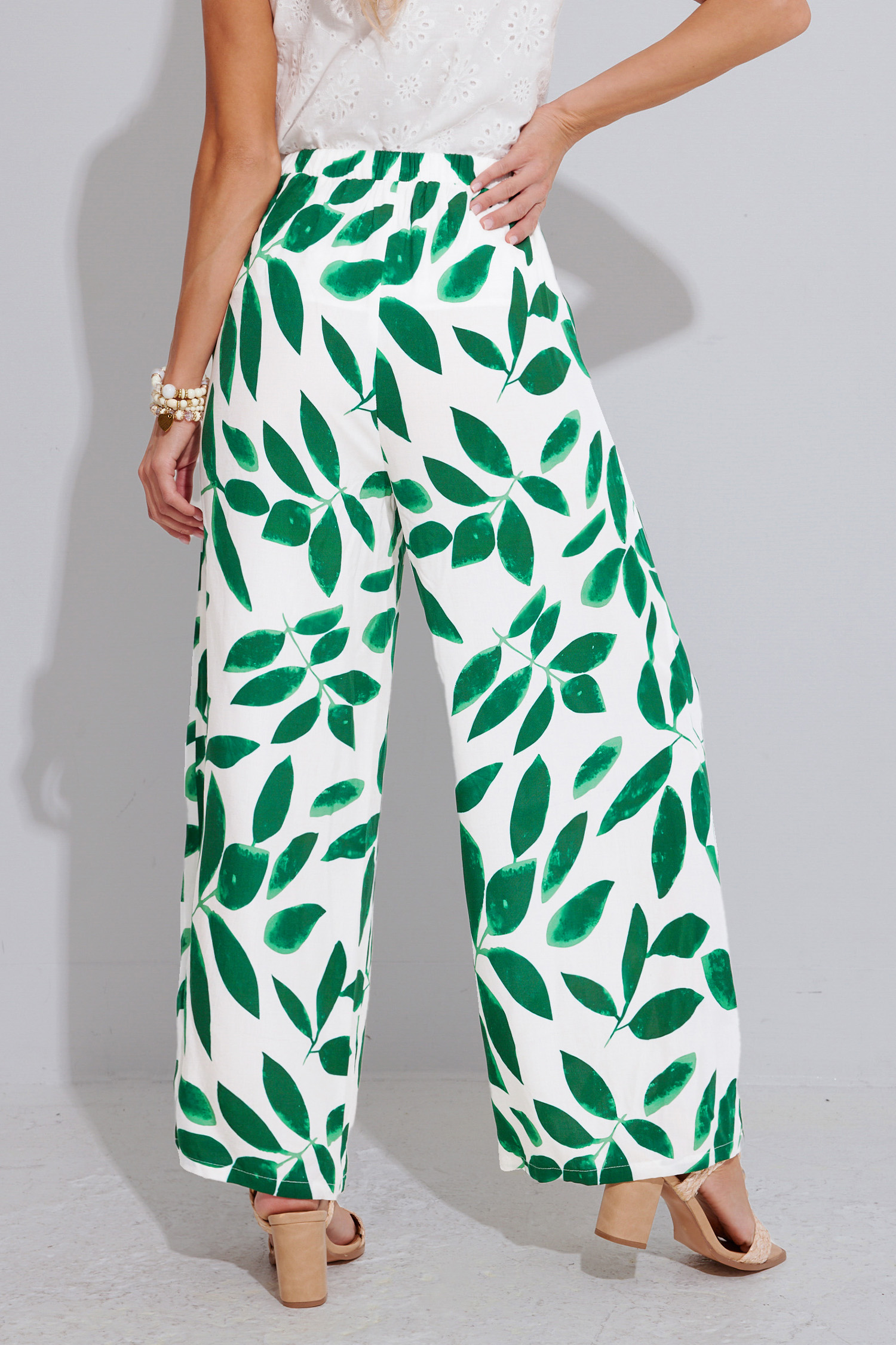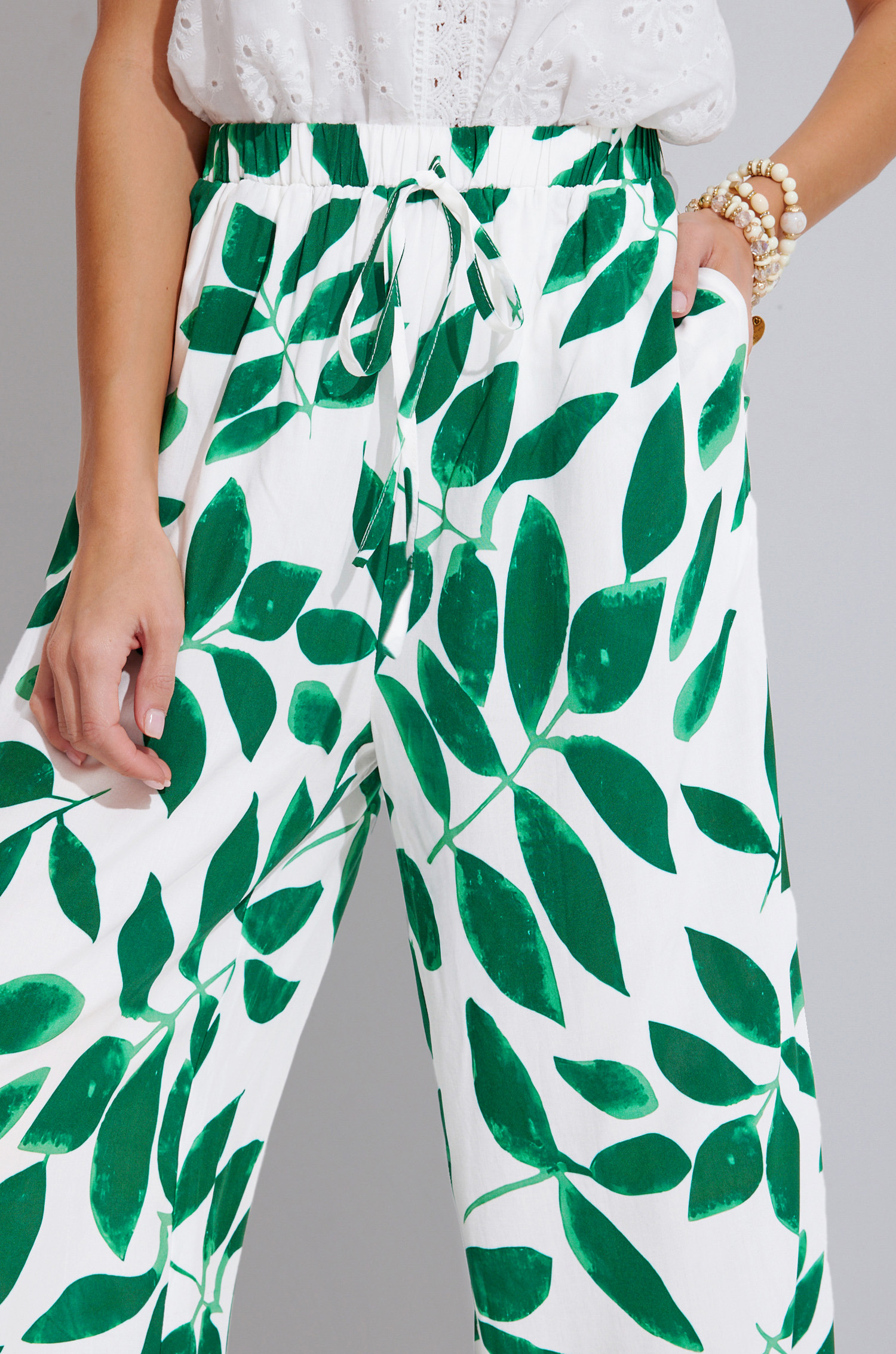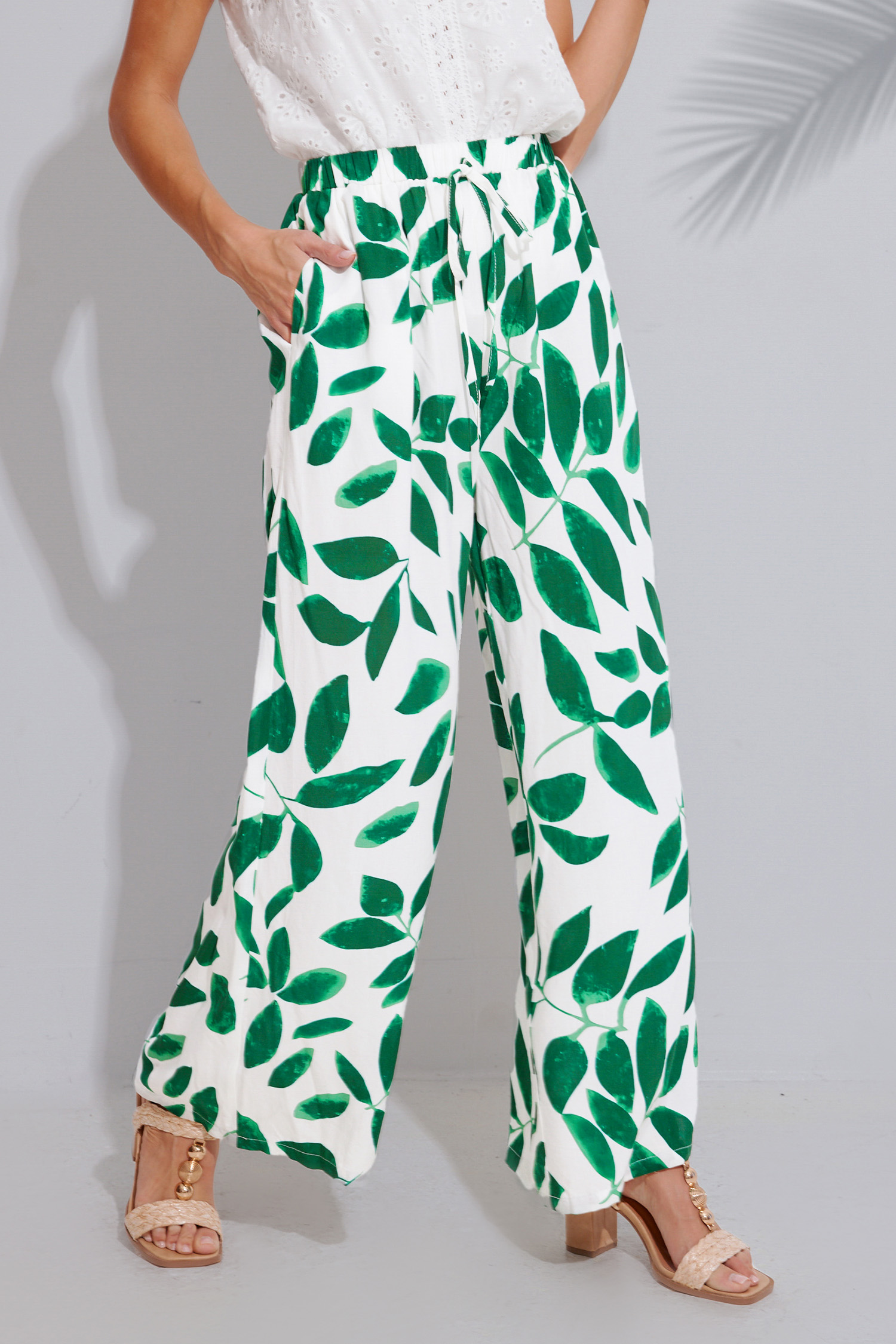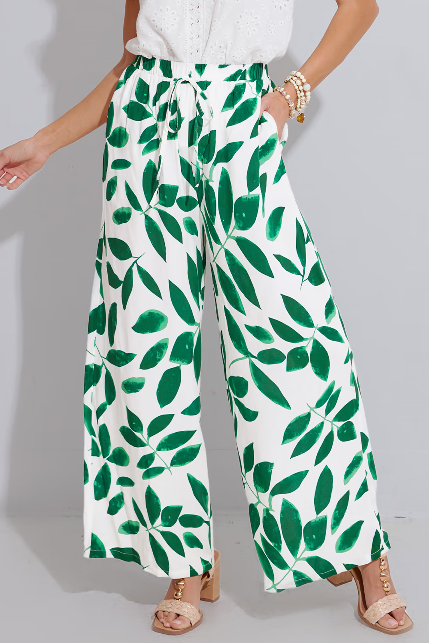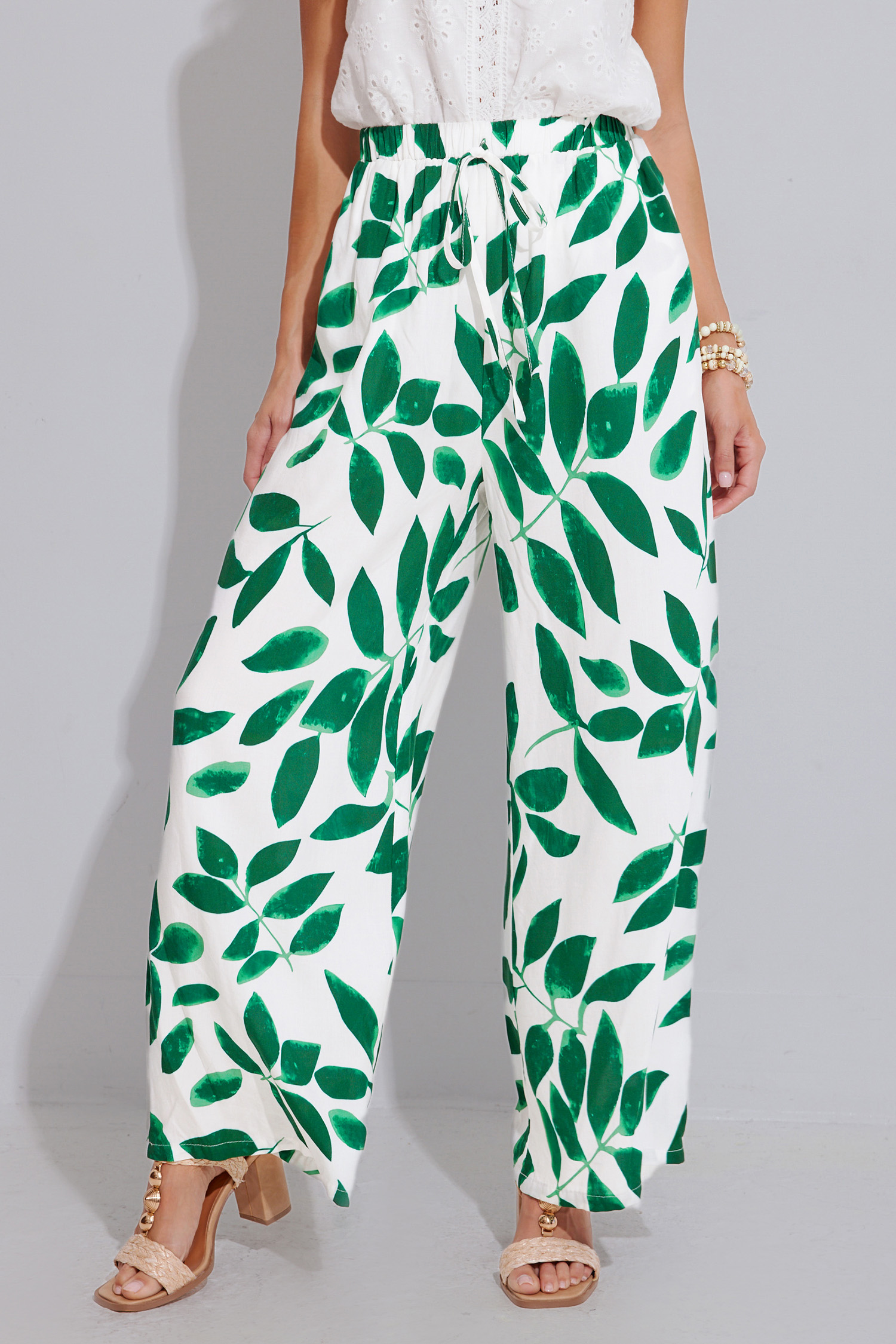 Pantaloni copricostume con coulisse a forma di foglia tropicale bianca e verde
