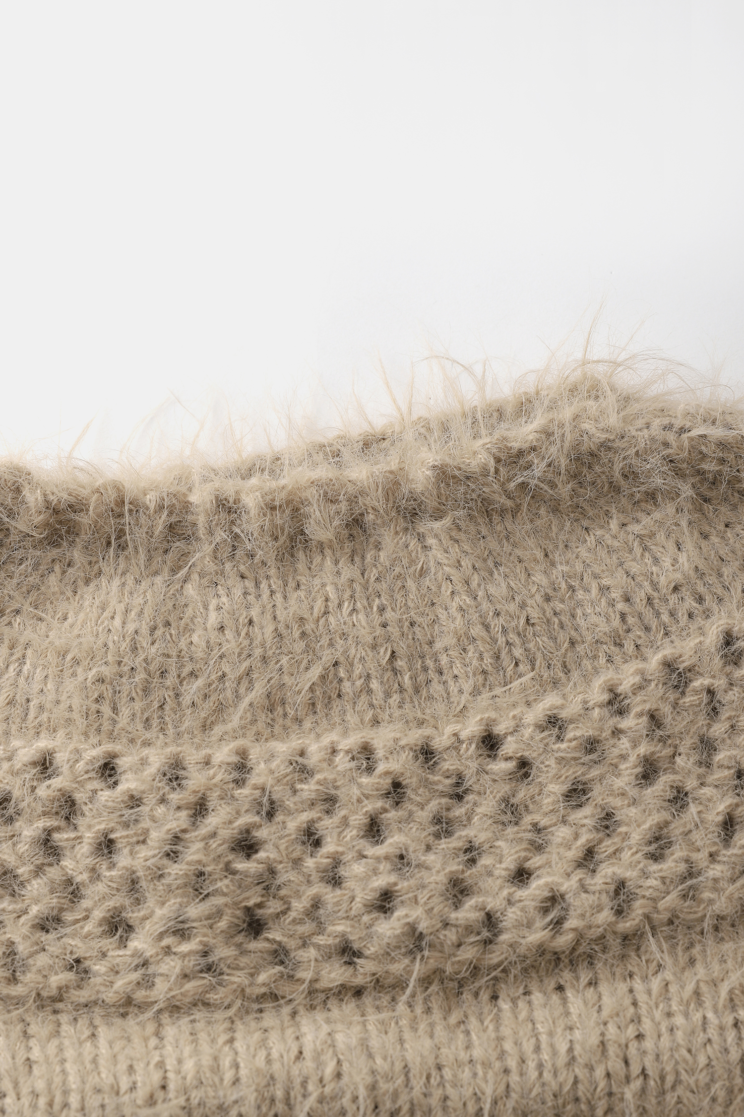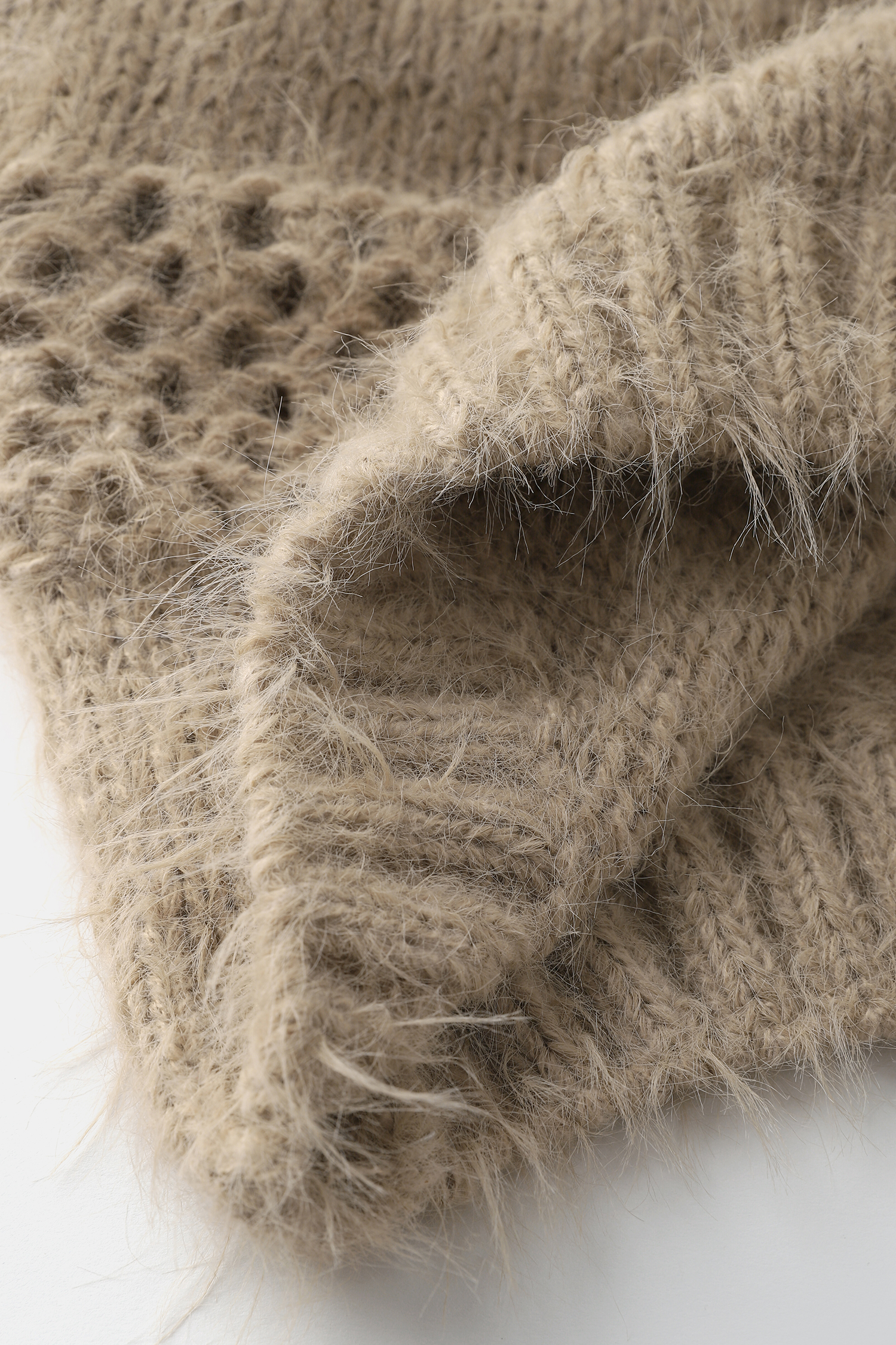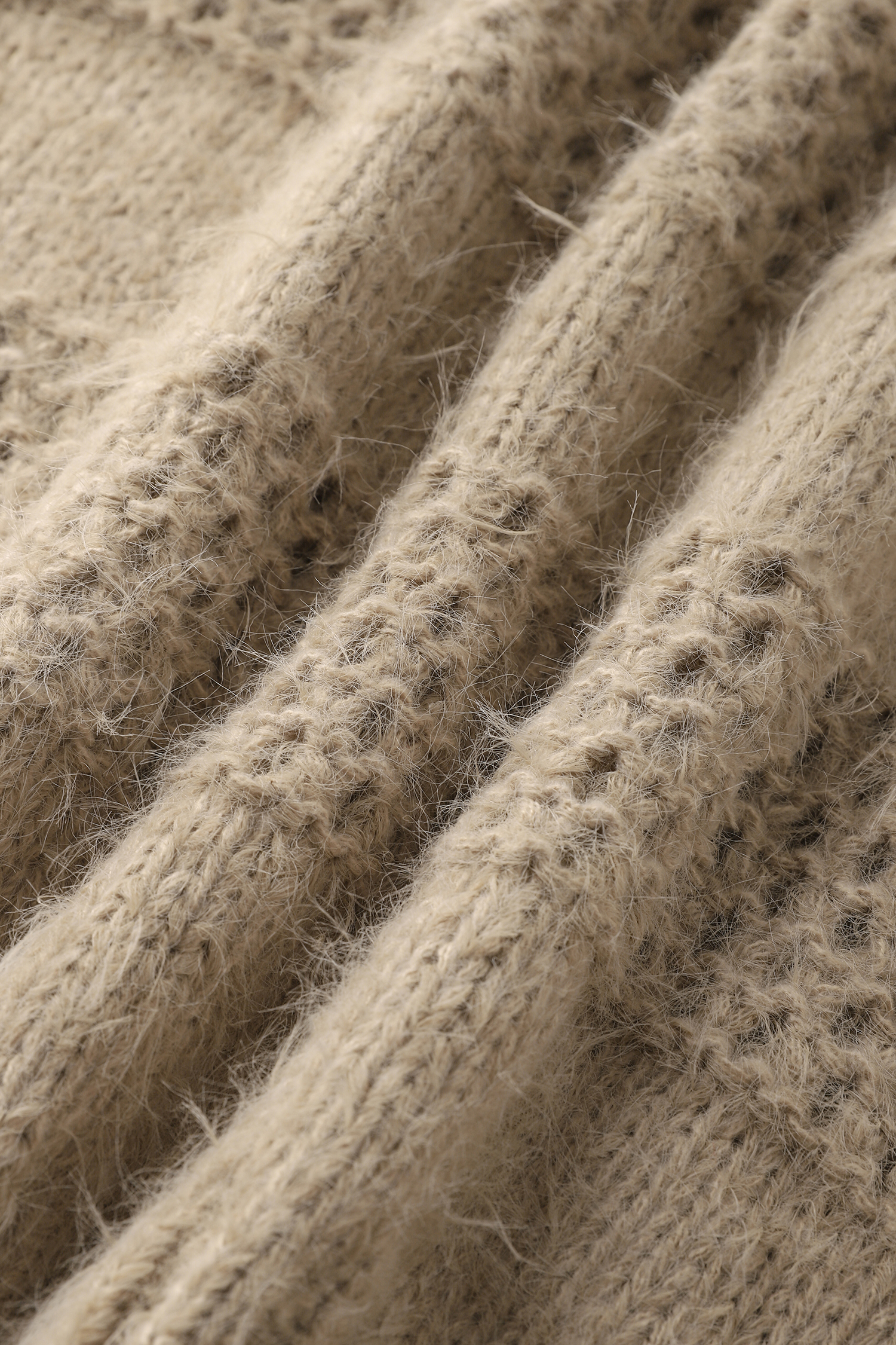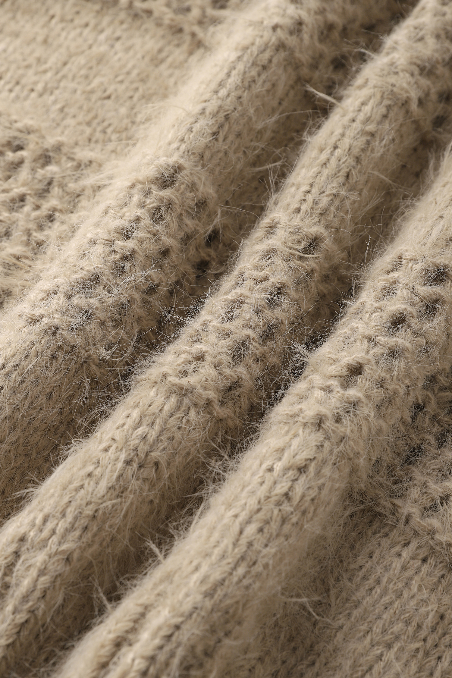 Abbraccia il calore e lo stile con il Camel Fuzzy Cutout Knit Sweater. Questo capo accogliente presenta una morbida texture pelosa che risulta deliziosa sulla pelle, perfetta per le fredde giornate di festa.